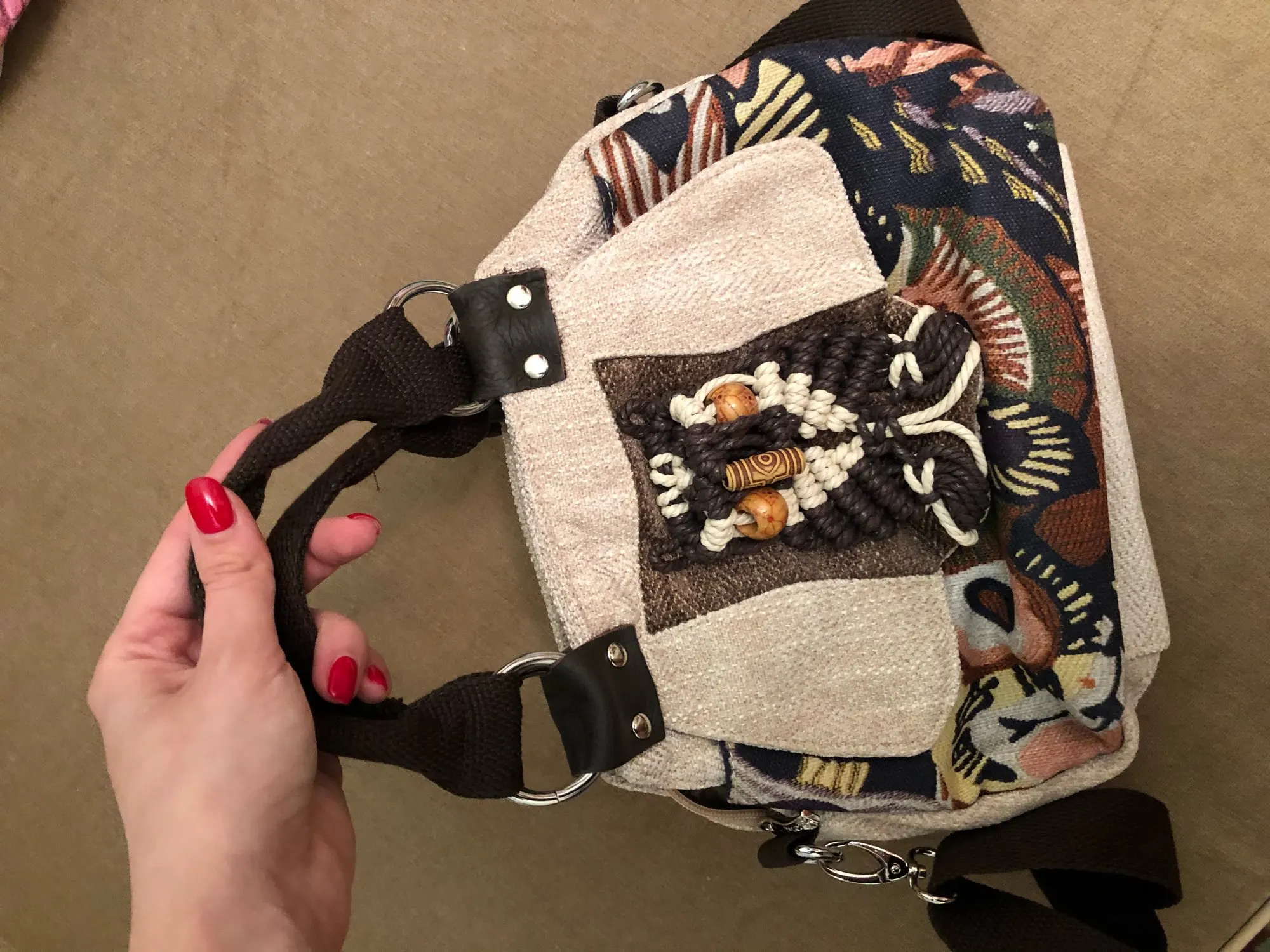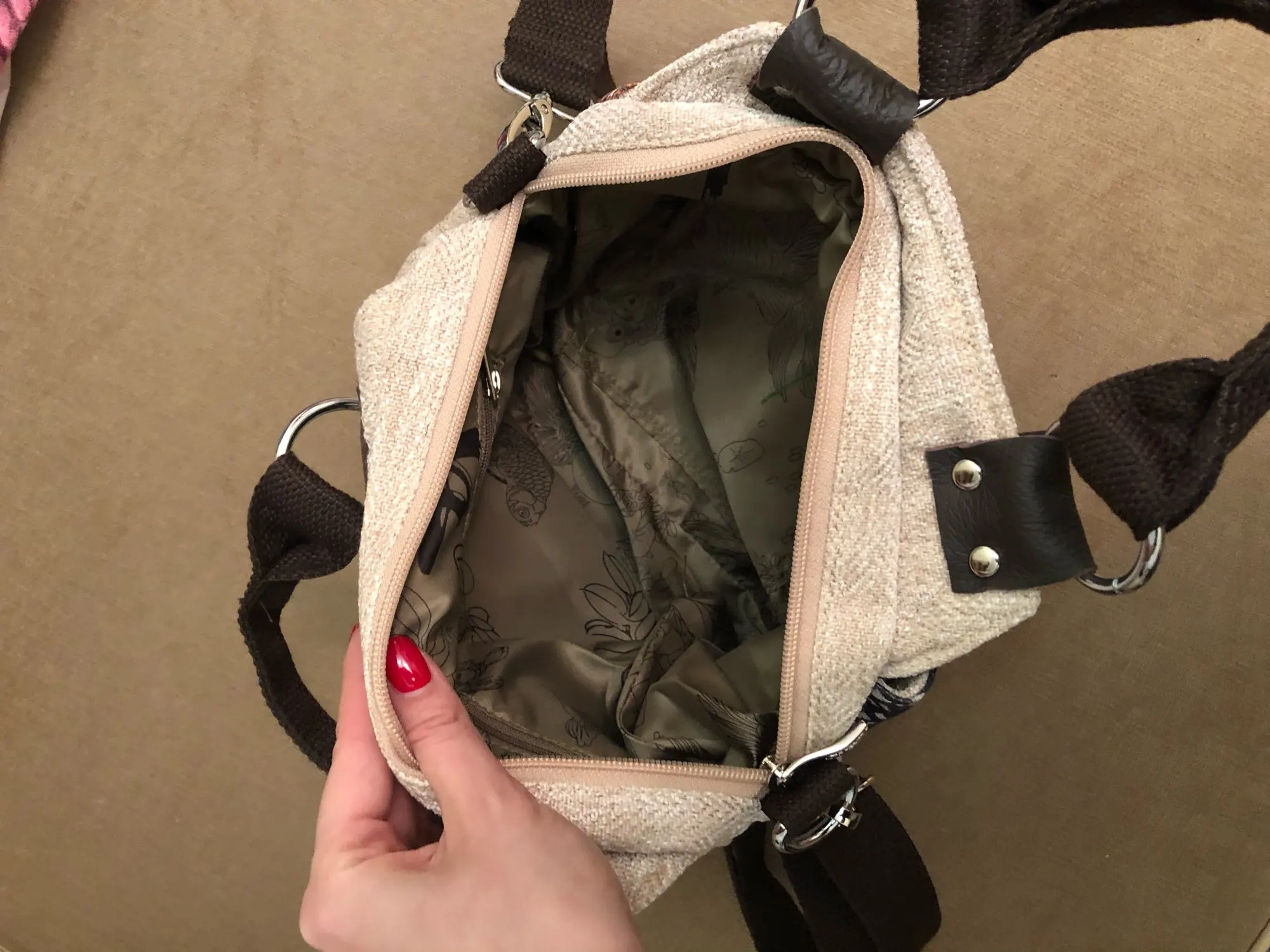 Отличная сумочка, не ожидала, но правда хороша! Внутри сумки карман на молнии и карман без молнии. На внешней стороне сумки: карман закрывающийся клапаном на котором расположен этнический орнамент и карман на молнии. Сумочка вместительная. Вообщем рекомендую!