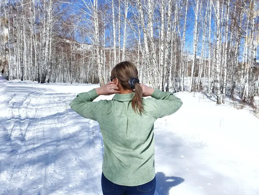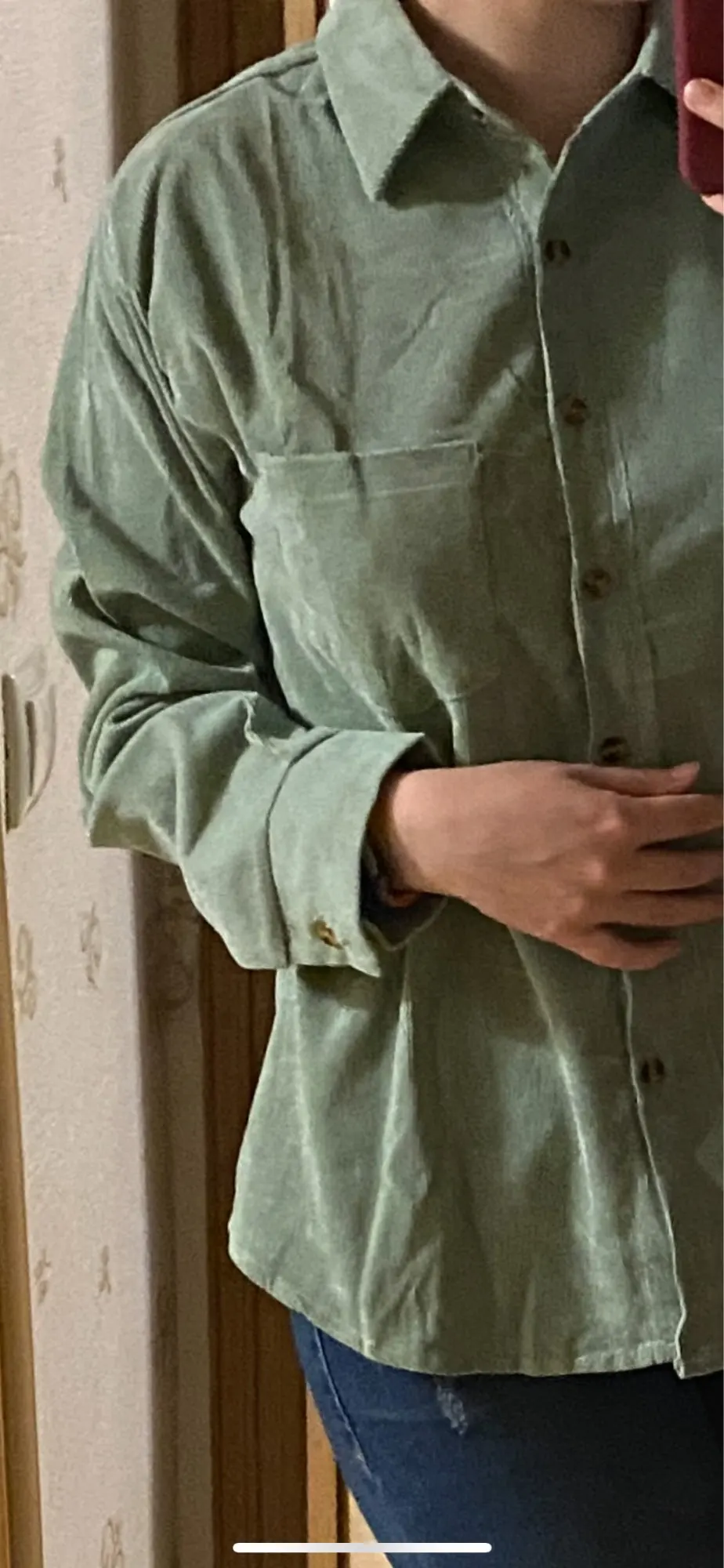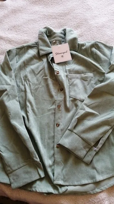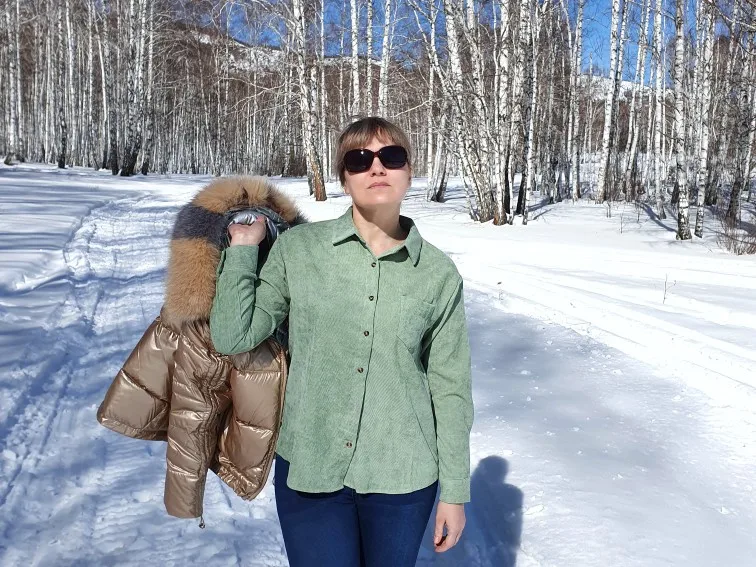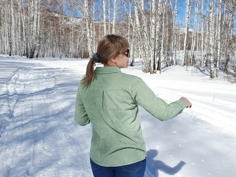 Материал средней плотности: хлопок и полиэстер, первого больше и она очень приятная к телу и на ощупь, не электризуется и не сильно мнётся при носке. По ссылке продавца она представлена в нескольких цветах, у меня цвет Green и он в реальности совпадает с цветом фото продавца. Линия плеч немного опущена, воротник отложной. Застёгивается на пуговицы коричневые по всей длине, манжеты на пуговицах, края немного закруглённые внизу. На груди небольшой карман. В целом я довольна покупкой и она классно смотрится как первый слой, так и второй. Цвет приятный.