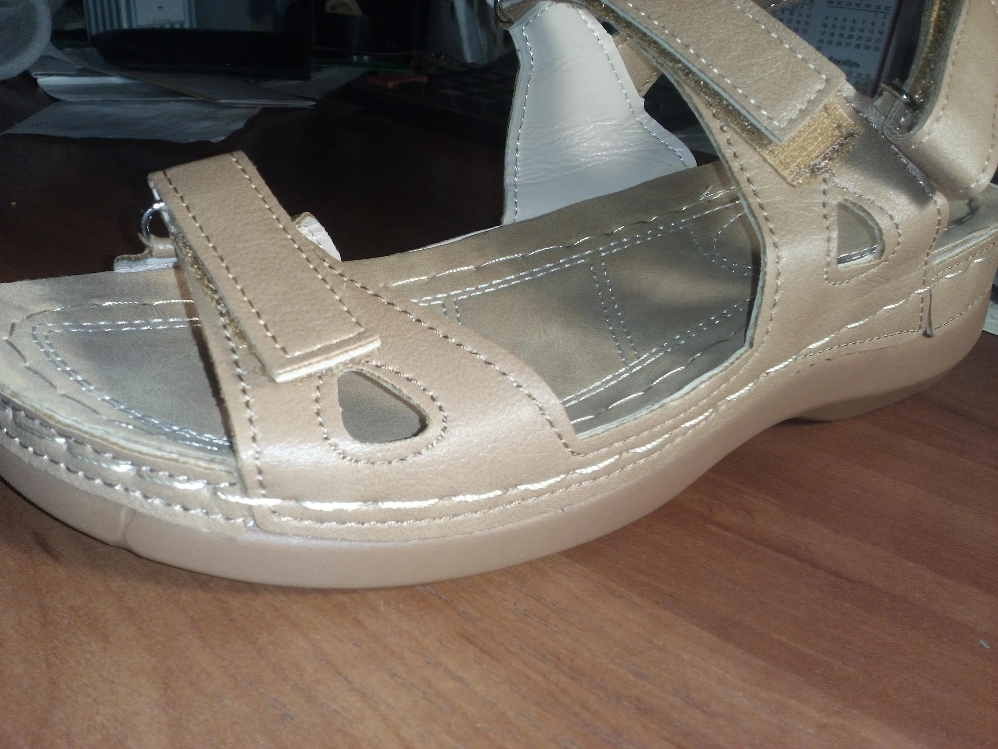 Лёгкие, мягкие, но не кожа. Думаю на сезон хватит. Удобно что липучки, летом ноги могут отекать, а тут регулировка. Высота каблука 3см, очень удобно.