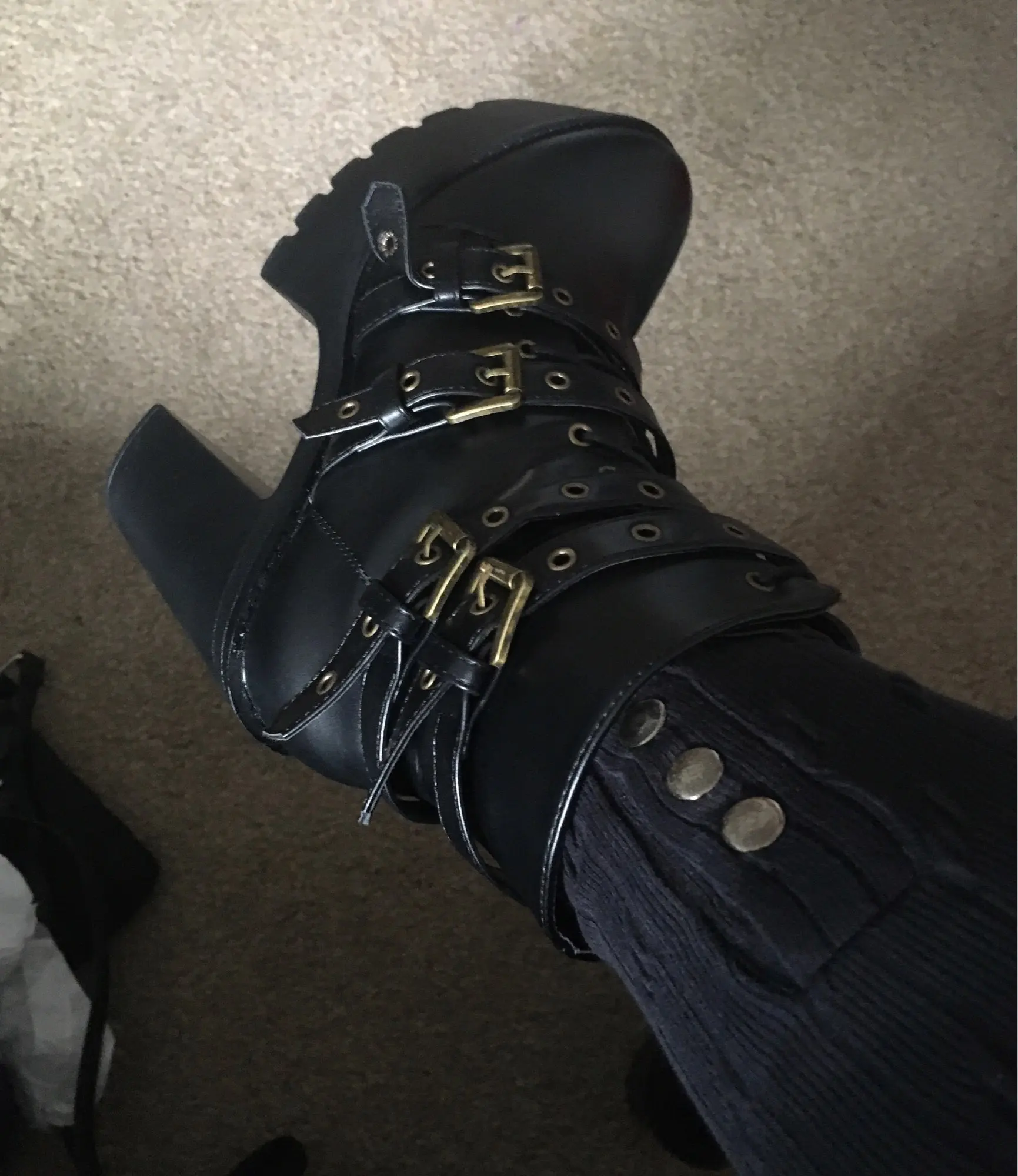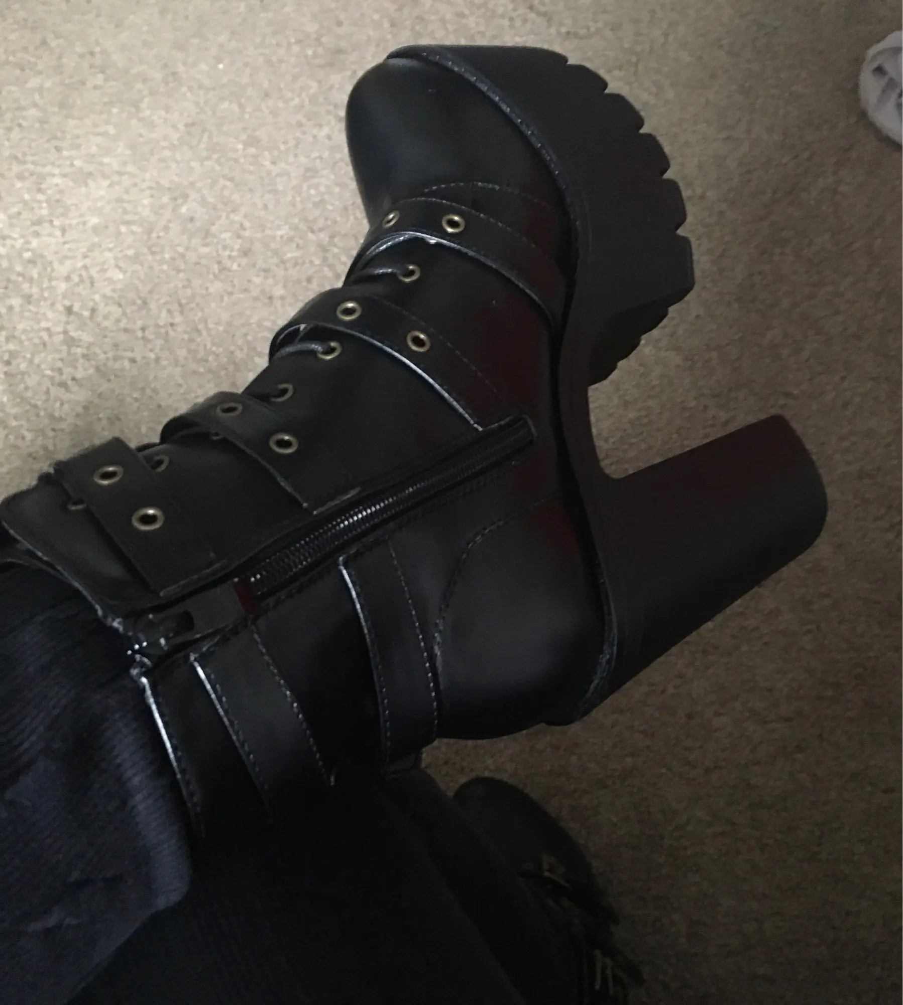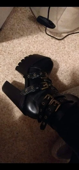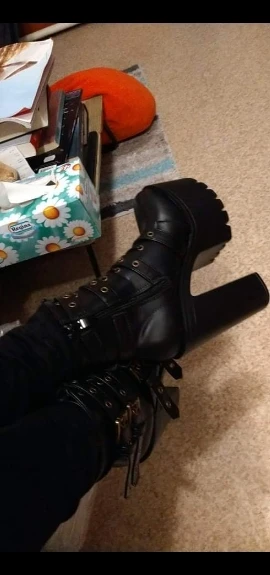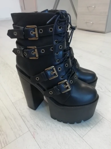 ОООЧЕНЬ крутые ботинки, размер как раз на 39-40, удобные, так как разница между каблуком и платформой небольшая (правда лестницы с трудом даются, а именно спуск xD). Клея не видно, каблук вроде крепкий, от ходьбы по дому не сломался... Дошли раньше срока, запакованы хорошо