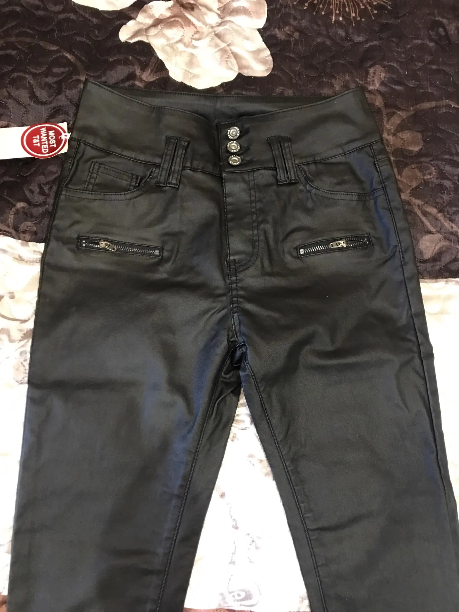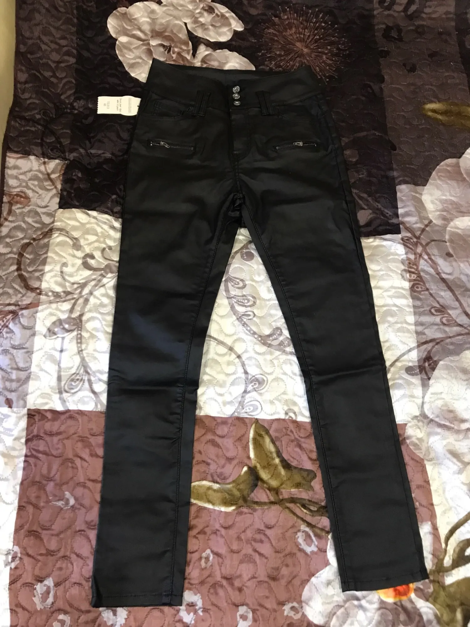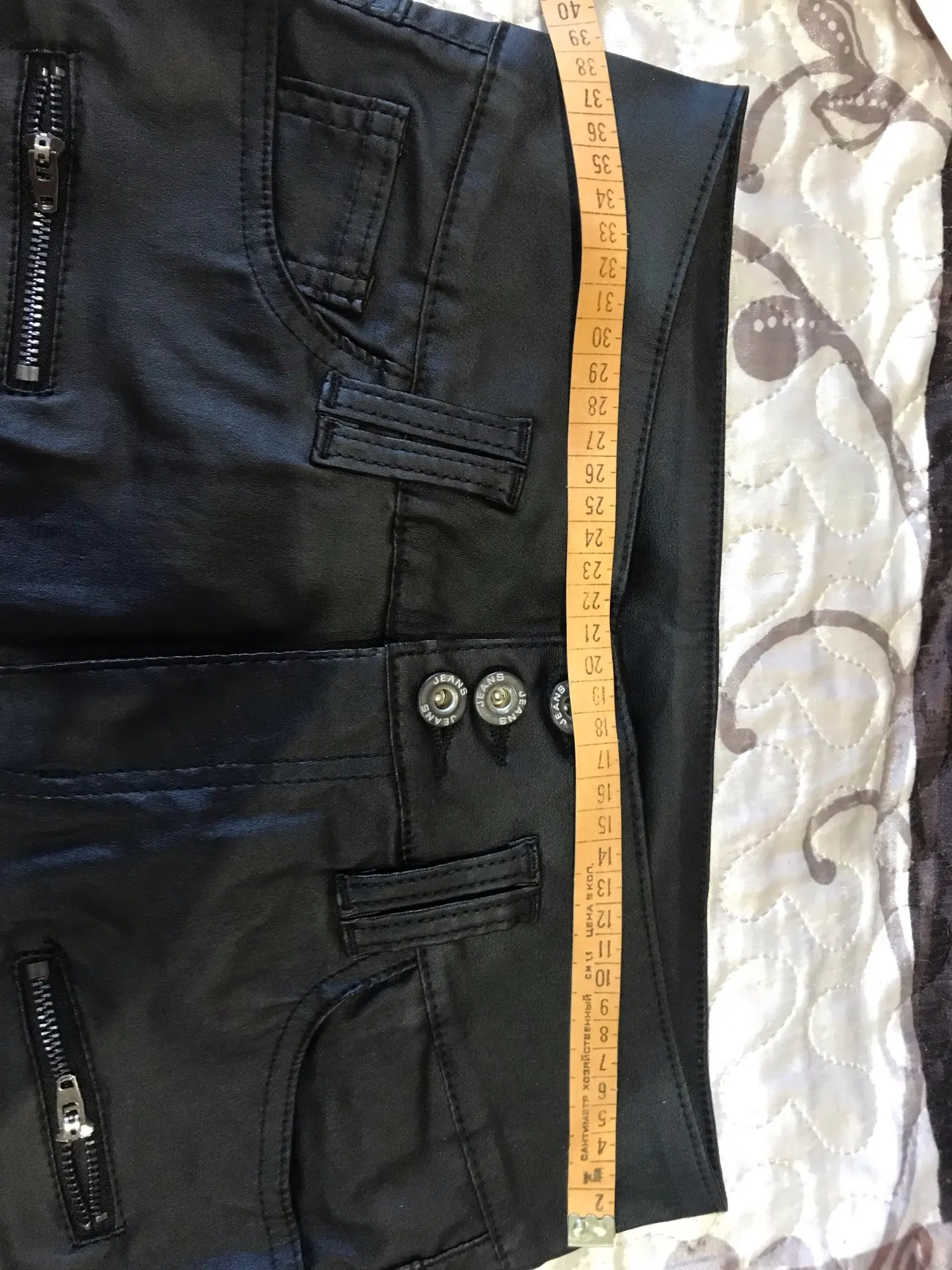 Брюки понравились. Ткань именно такая, как я предполагала. Думаю в носке она будет лучше, чем искусственная кожа. А вот с размером немного ошиблась. Ткань хорошо тянется, и я люблю плотное облегание. На мои 92-110 заказанный 44 р-р свободен. Надо было на р-р меньше брать. На рост 150 длинны очень, и талия высоковата (см. фото), скручивается при носке. Мне так неудобно. Продавцу за брючки спасибо.