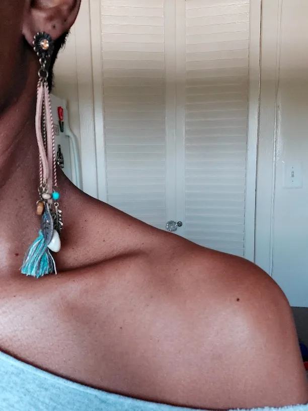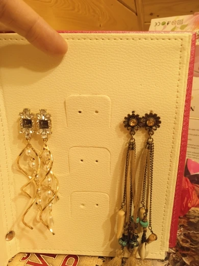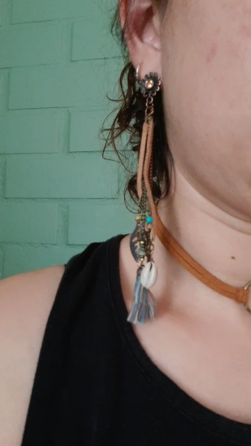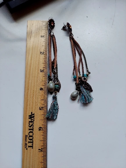 весьма длинные серьги. детали пластиковые. хорошо, что не тяжело для ушей, но выглядит дёшево