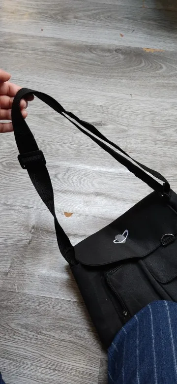 сумка классная свои функции будет выполнять отлично. она мне нужна для шараги, так что меня все устраивает. внешний вид вполне точный с картинкой. только без чего либо сумка не держит форму и это не оч. планета блеклая по сравнению со значками, так что я ее заклею каким нибудь патчем. липучка находится не совсем нужном, как мне кажется месте, Но это можно исправить просто пришив другую ниже. Помещается там кстати прилично всего я запихнула пенал, 2 тетради а4, ещё парочку толстых тетрадей и вполне норм. правда не думаю что она выдержит каких нибудь 8 учебников, так что если надо много чего тяжело таскать вряд ли подойдёт. я даже удивилась кст, на что там есть молния закрывающая большой карман это удобно, но ее криво пришили и она не доходит до конца. маленький карман на молнию не закрывается. ремень регулируется до отличной длины, прям как я хотела, что бы она была на поясе. пришла за недели 2, что достаточно быстро. короче все круто