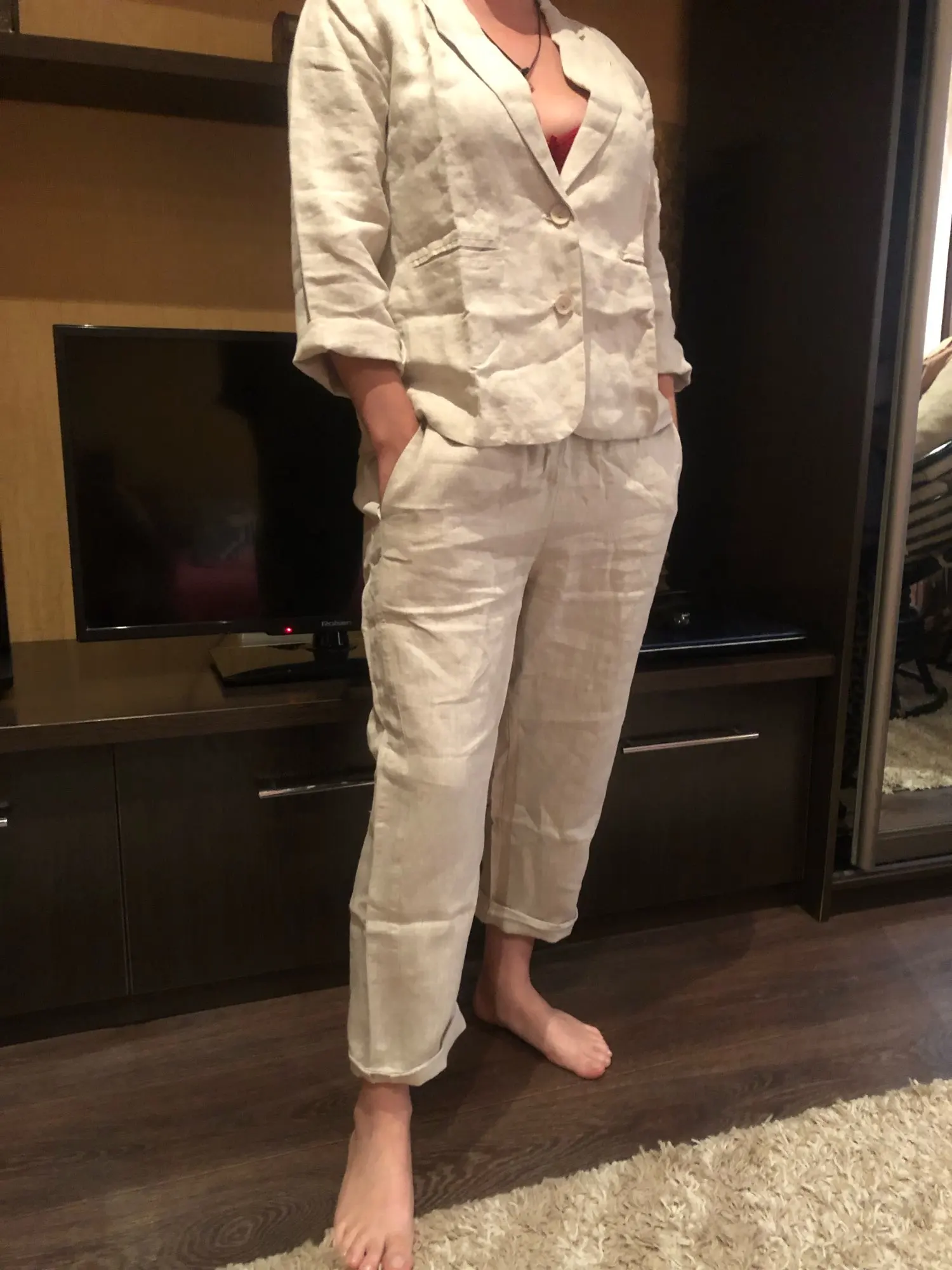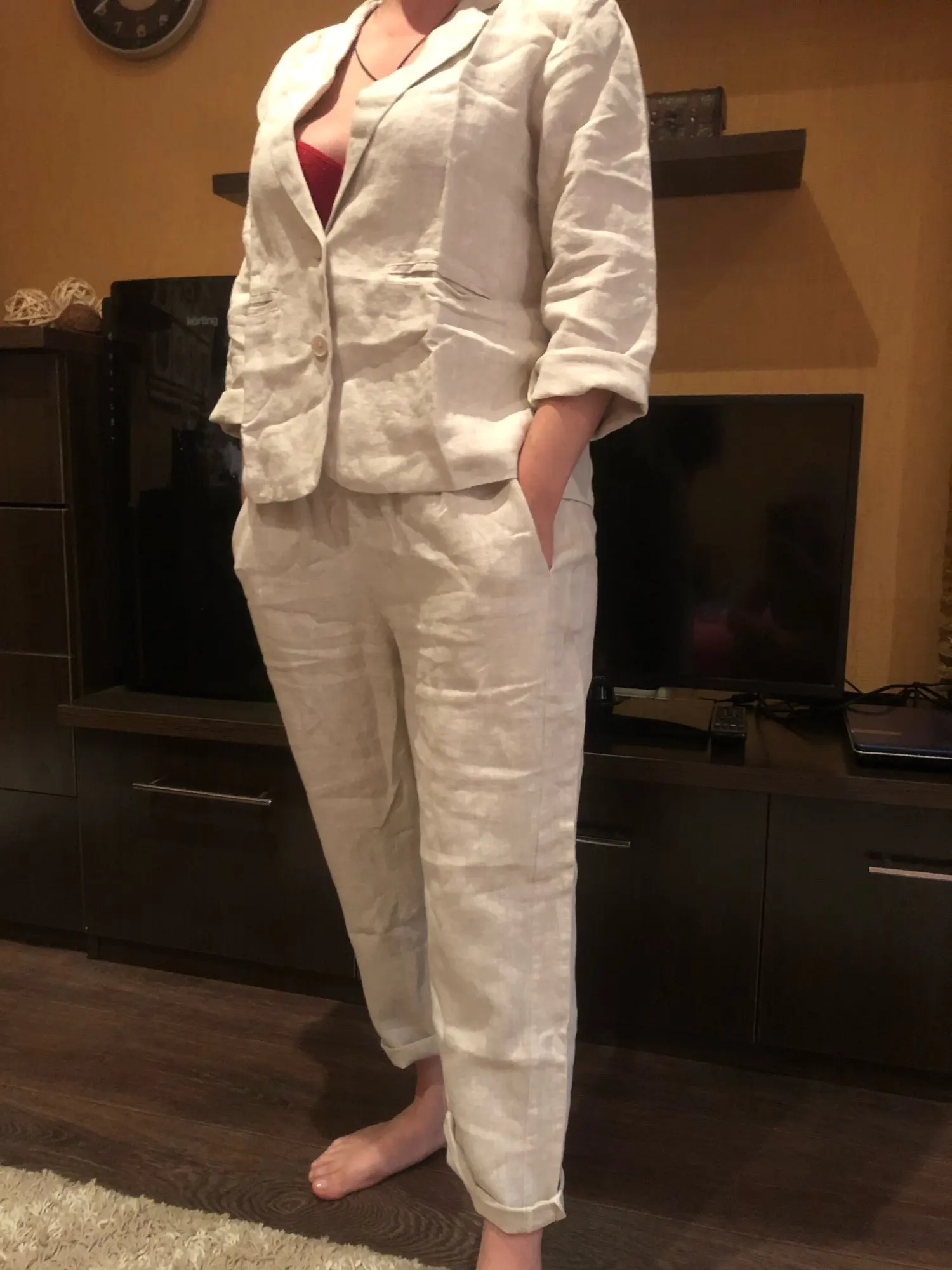 Женские свободные льняные костюмы, однотонные Винтажные льняные костюмы, блейзер + брюки с эластичным поясом, женские костюмы
