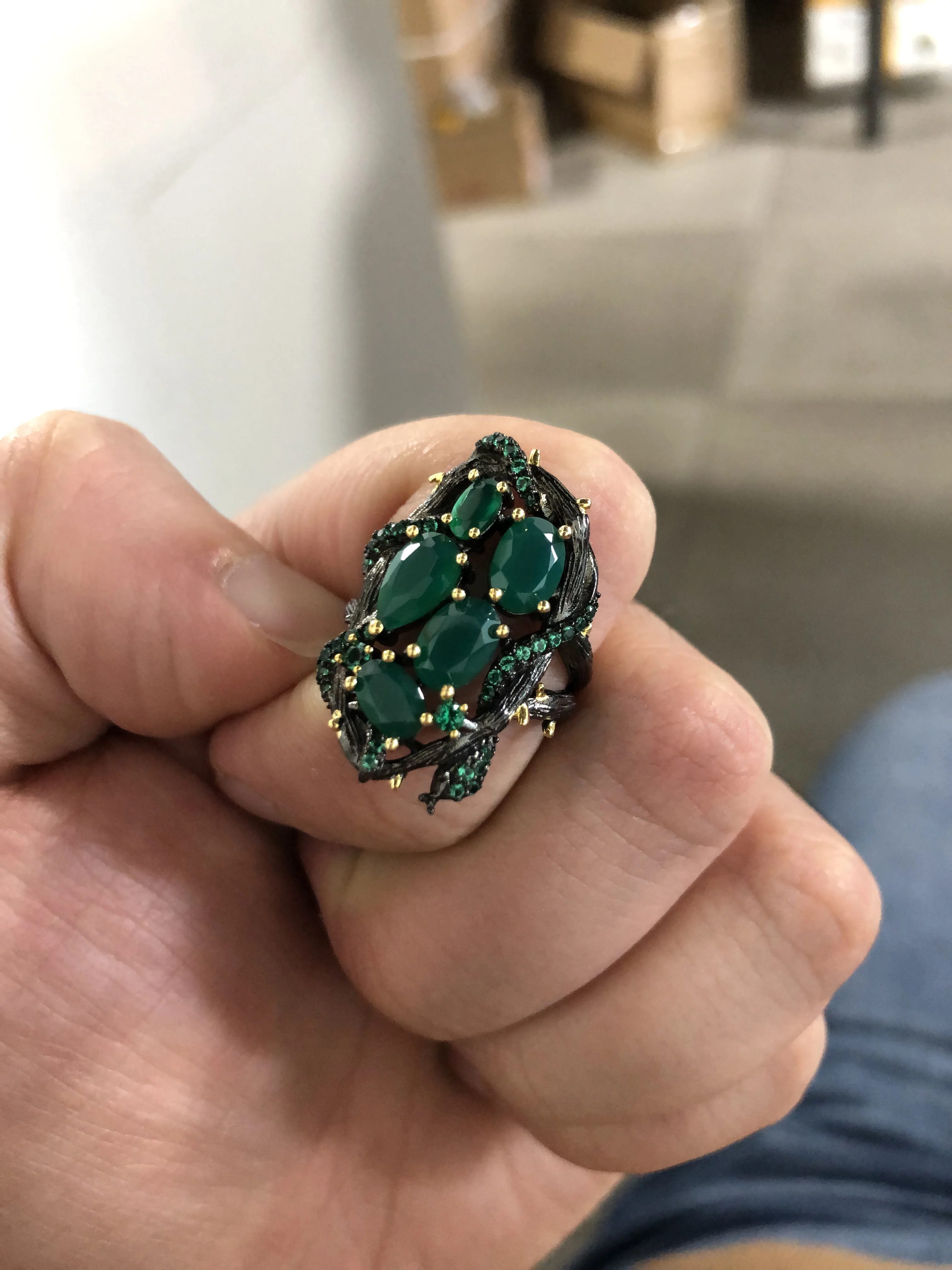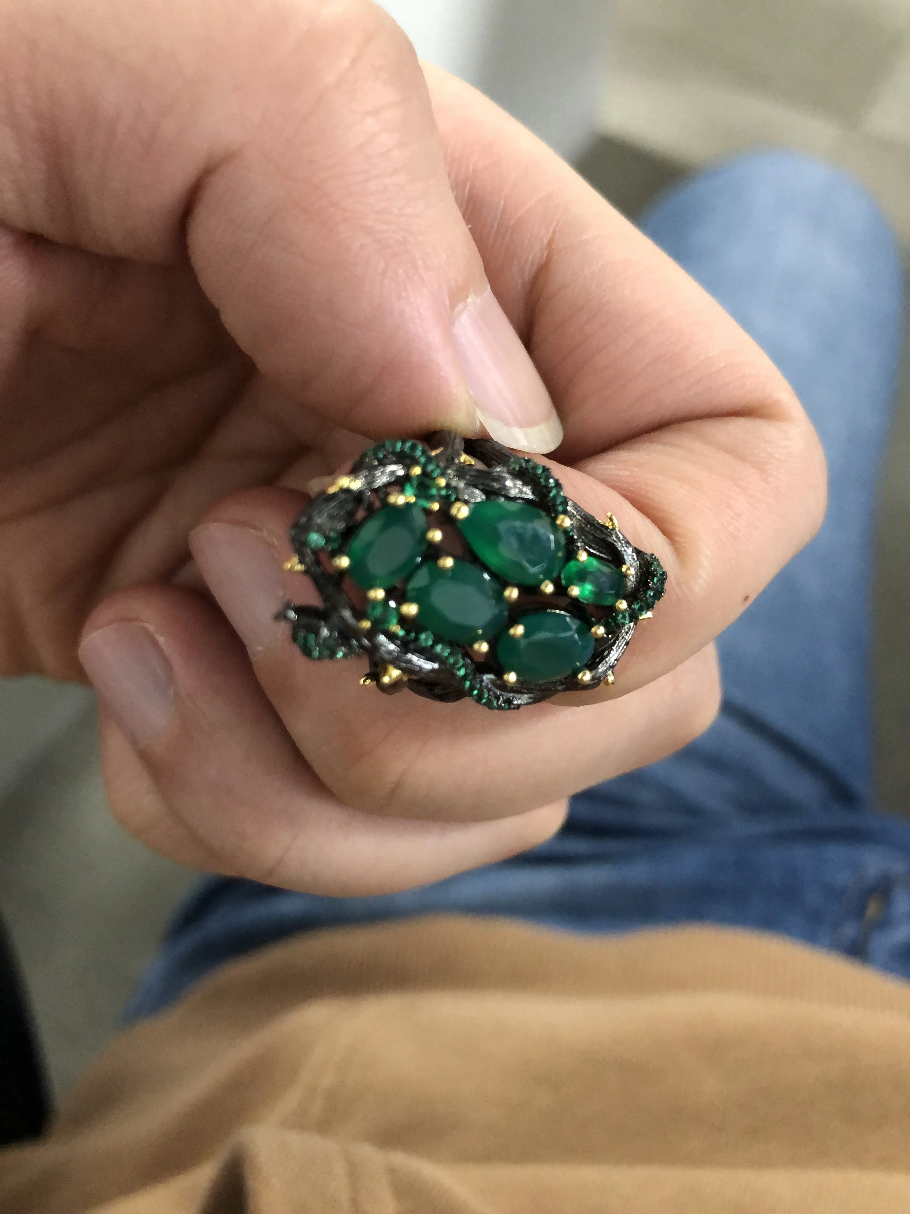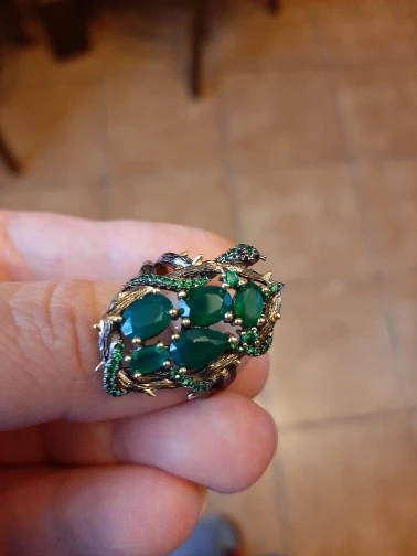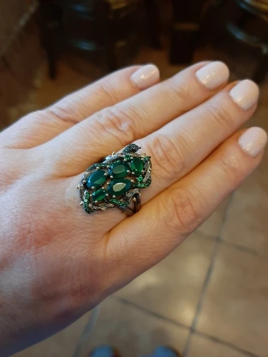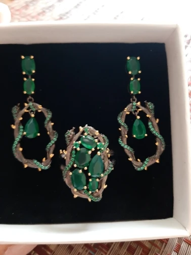Набор шикарный. Он лучшее чем на фото. Красивый, насыщеный цвет камней, змея, которая обвивает круги, тоже выполнена маленькими блестящими камушками, крапана окрашены золотым цветом, все это очень красиво. Размер 10 соответствует 20. Замочки на сережках закрываются и держат отлично. Сами серьги имеют небольшой вес, но на ушках это не ощущается. Мне очень понравился набор, долго я к нему присматривалась, и не пожалела, что купила.