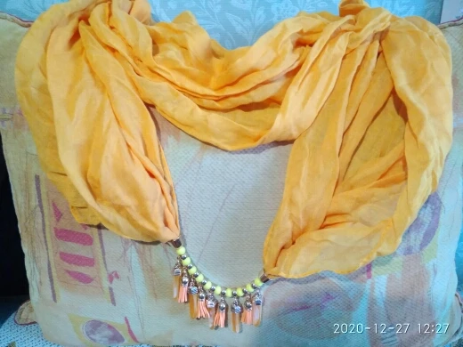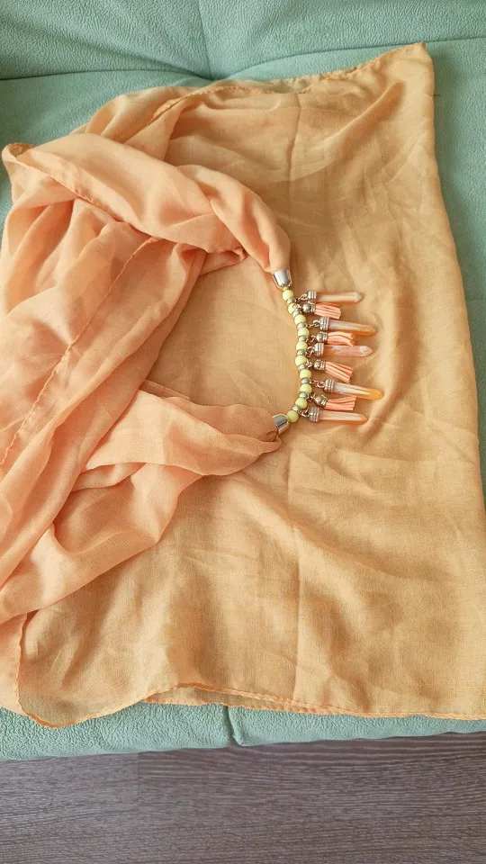 Отличный шарф, красивый, как на фото продавца. Не синтетика, ближе к х/б. Висюльки бренчат. Всё отлично. Рекомендую товар и продавца.
