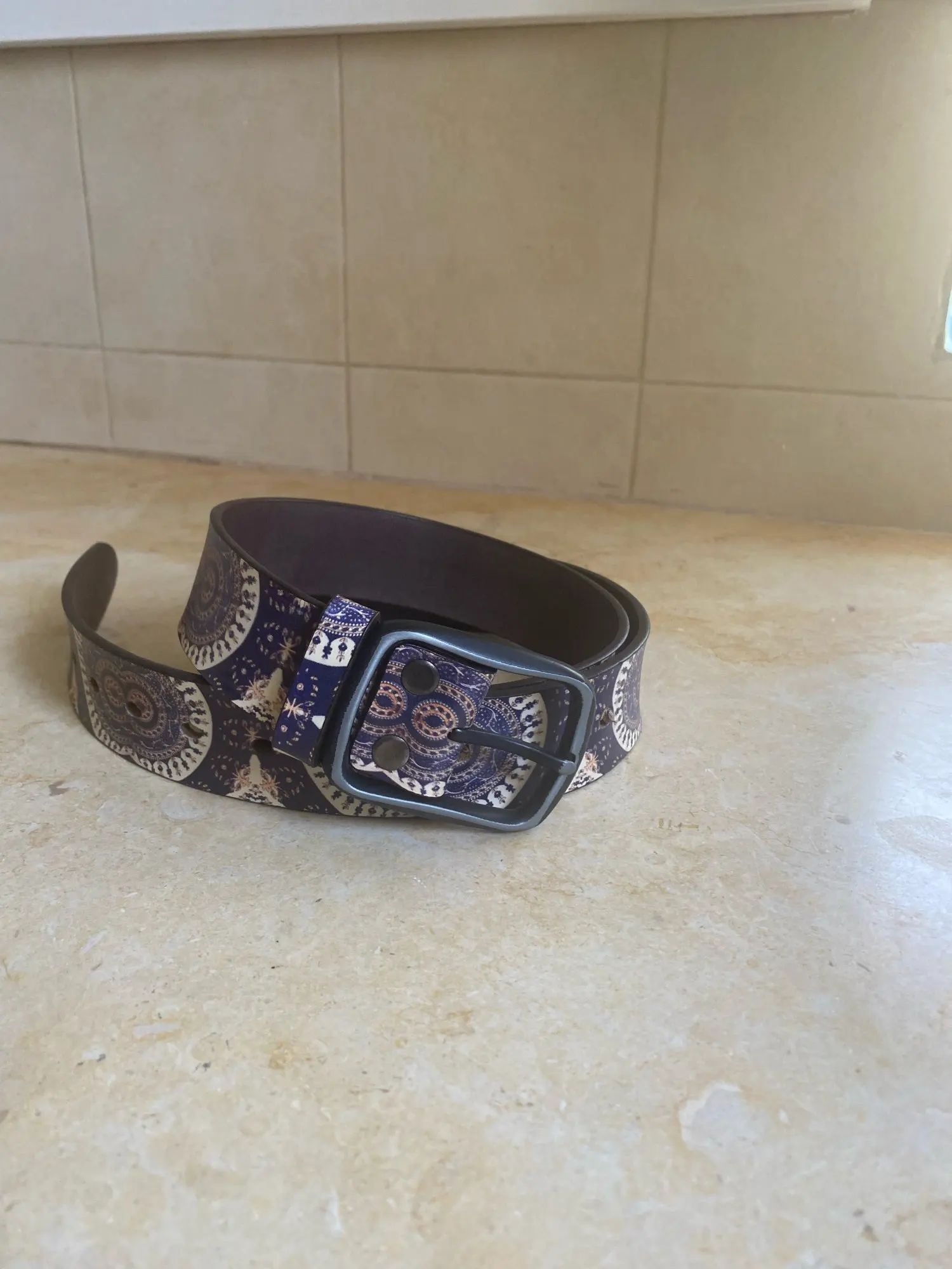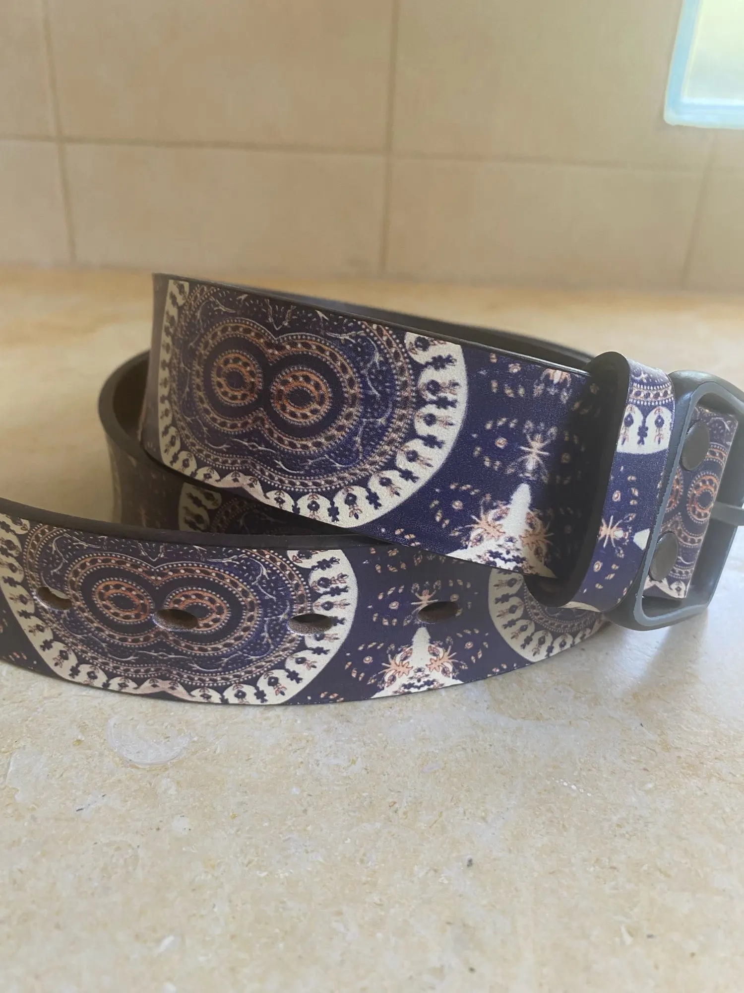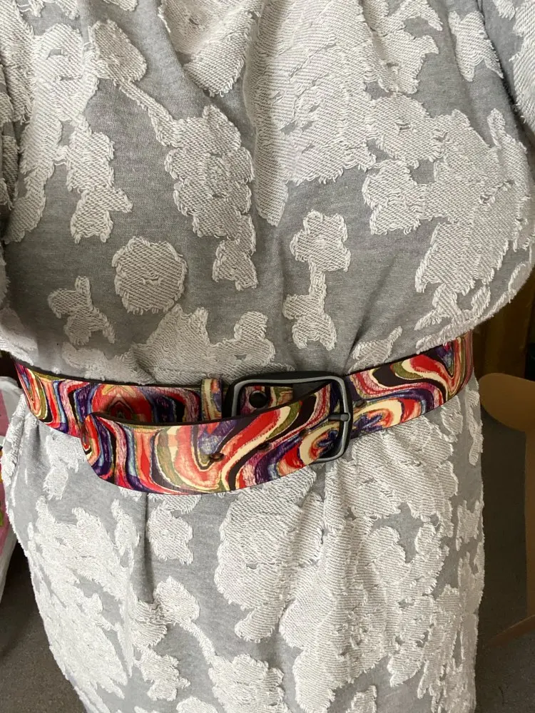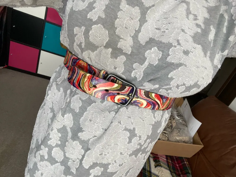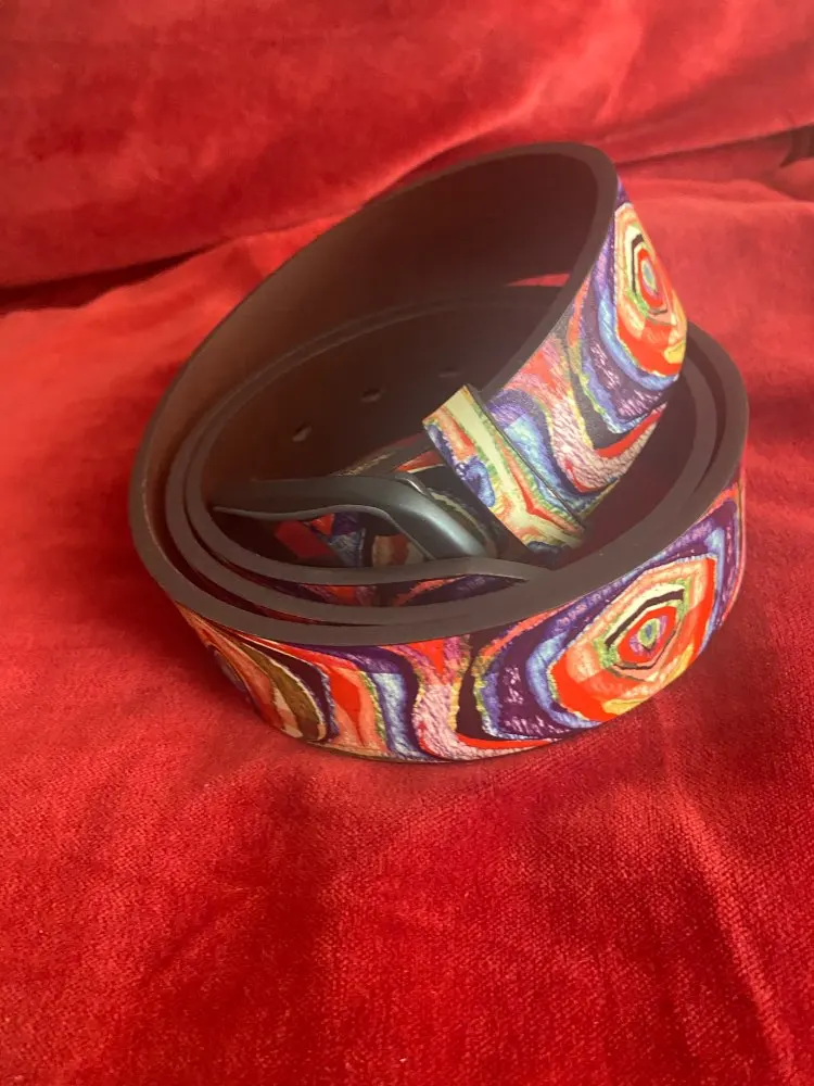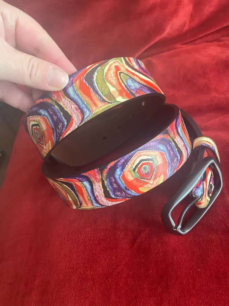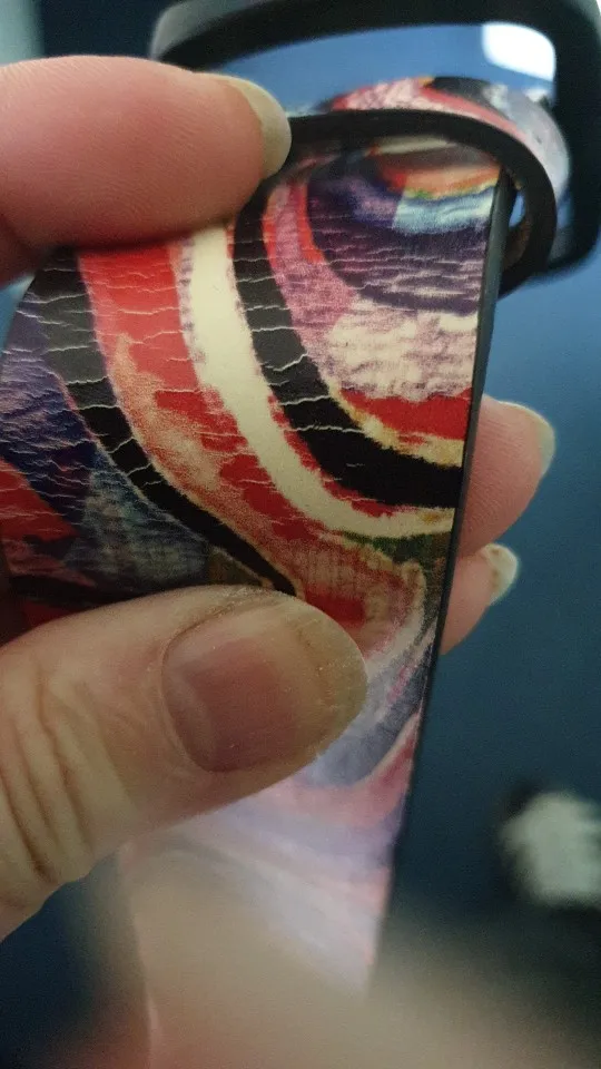 Расчветка яркая, как на картинке. Кожа - искусственная. Длинна - включая пряжку. В следующий раз возьму подлиннее. При сгибание образуются трещины, если часто носить наверное прослужит недолго.