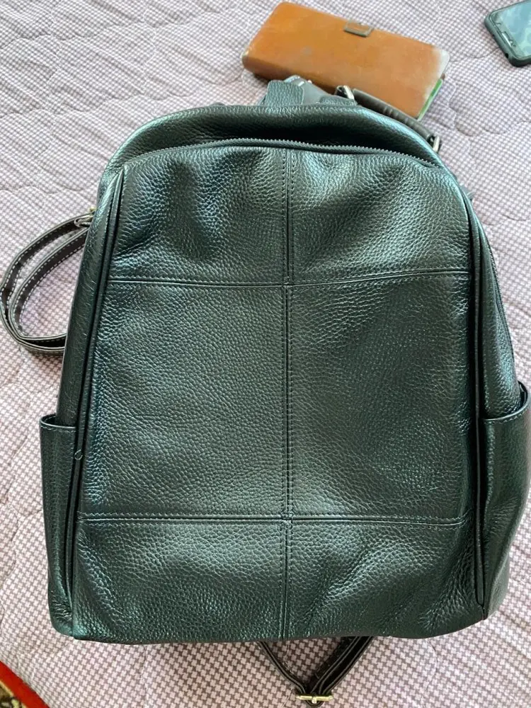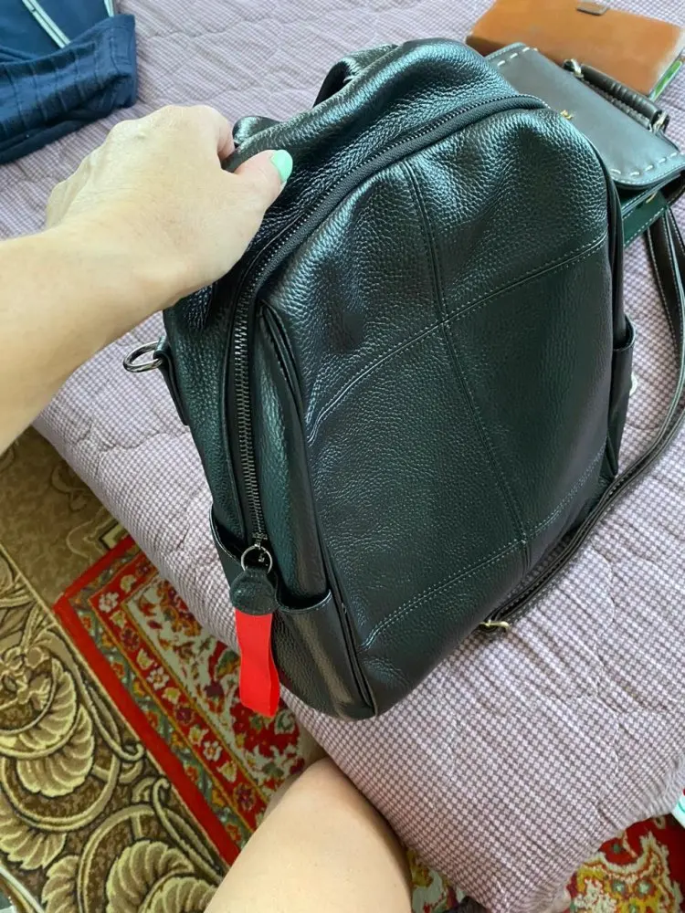 рюкзак замечательный. все прошито, ровно, продумано. кожа толстая как у керзовых сапог, поэтому рюкзак держит форму. сначала были большие сомнения настоящая кожа это или нет, но после тестов и сравнения с настоящей кожаной сумкой у мужа, точно убедилась, что натуральная кожа. я рада. папка с а4 влазит, чуть уголки подгибаются, но не критично. много входит. продавец отвечает оперативно. молодец! первая покупка на али натуралки. я рада.