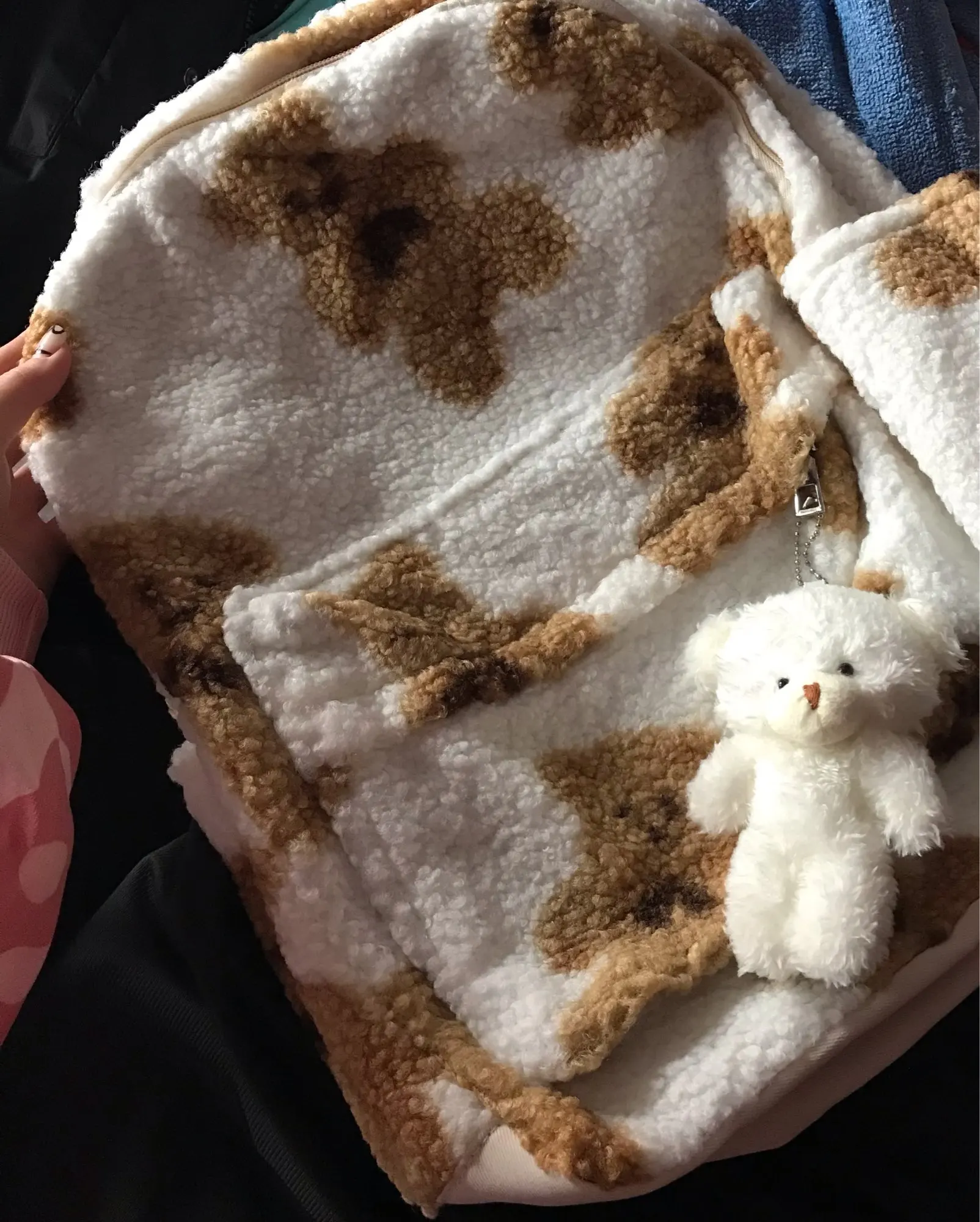 На картинке рюкзак больше чем в жизни,но ничего,размера он среднего,пока что не сыпется и не линяет,достаточно милый,довольная покупкой)