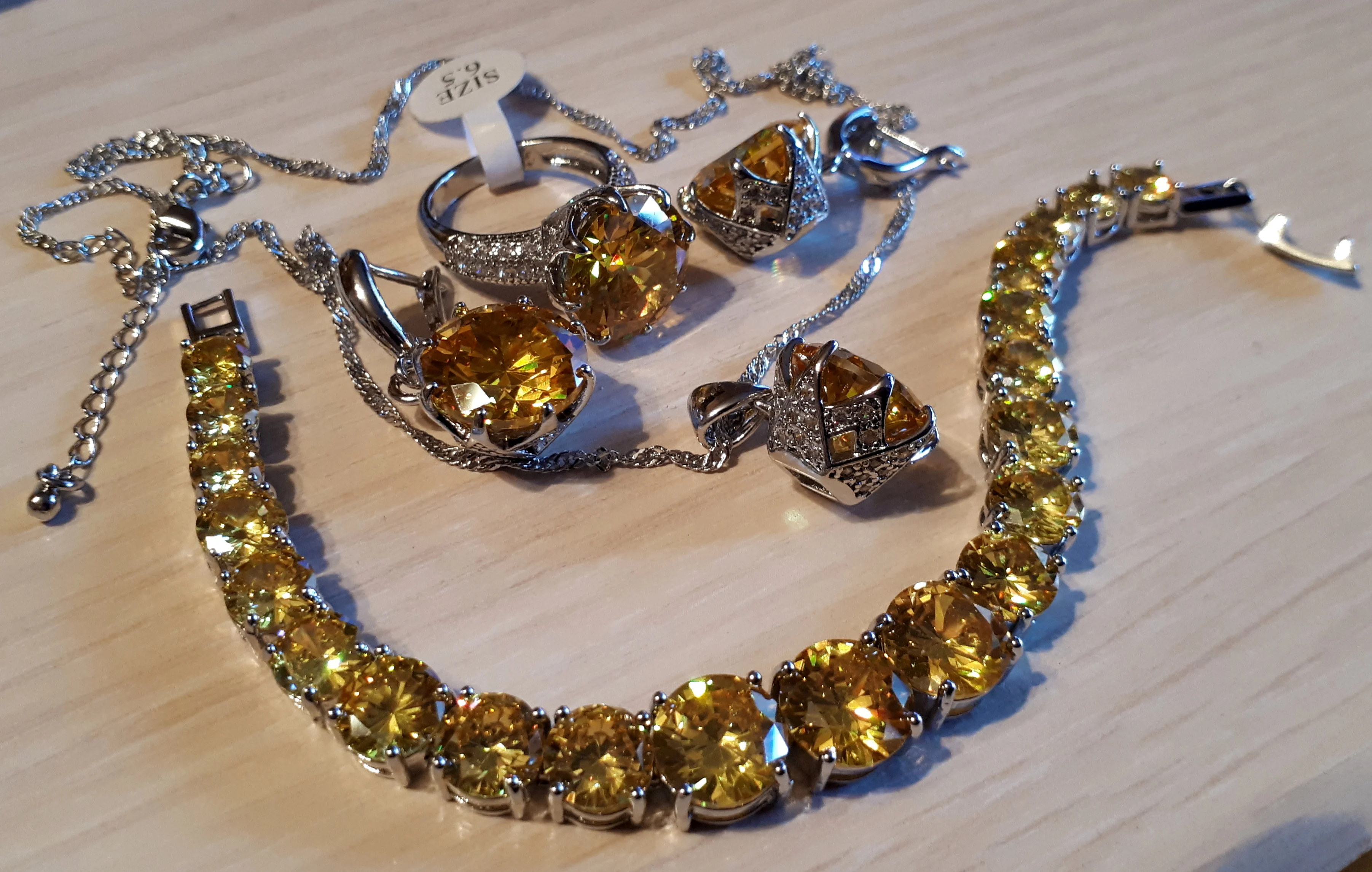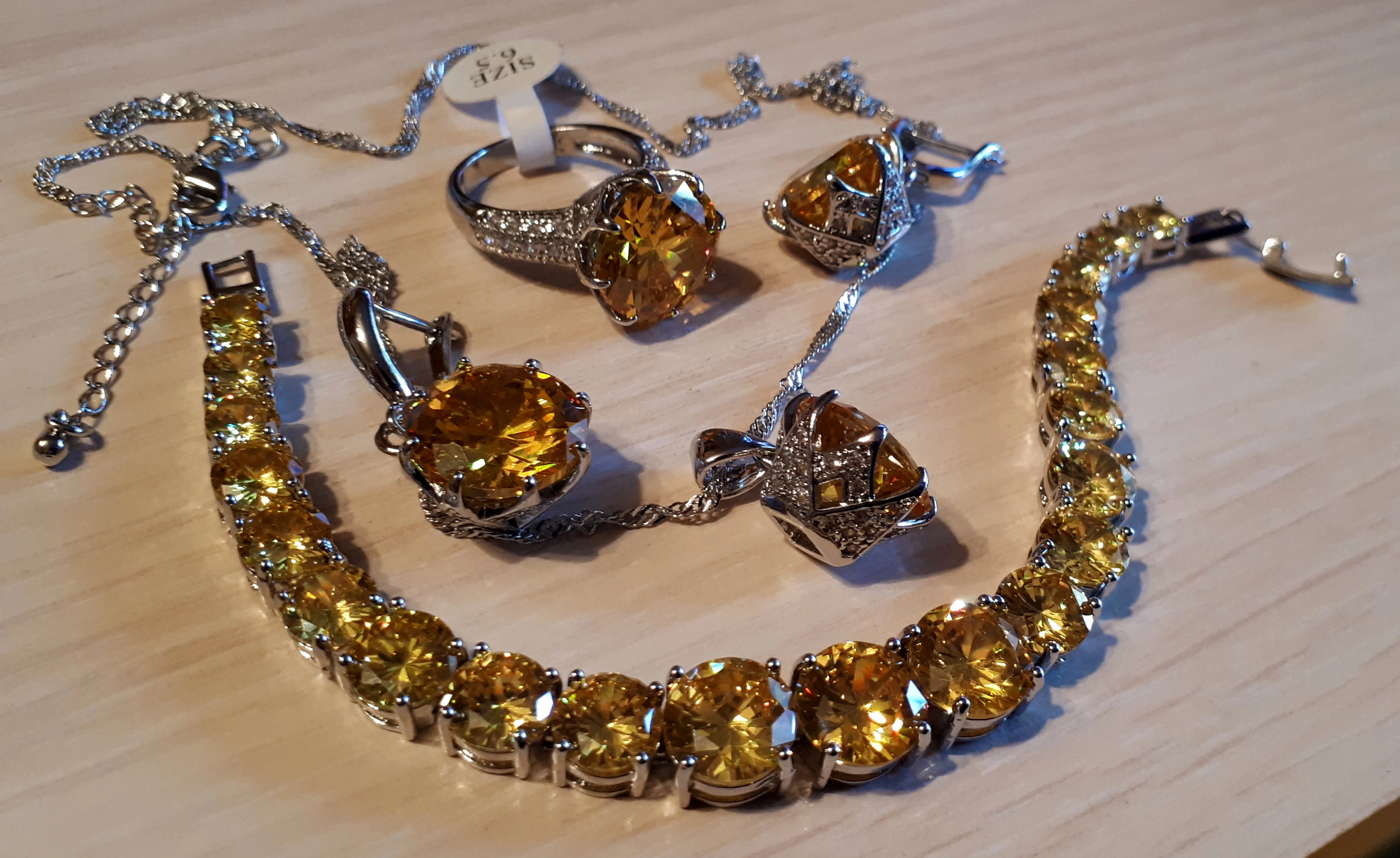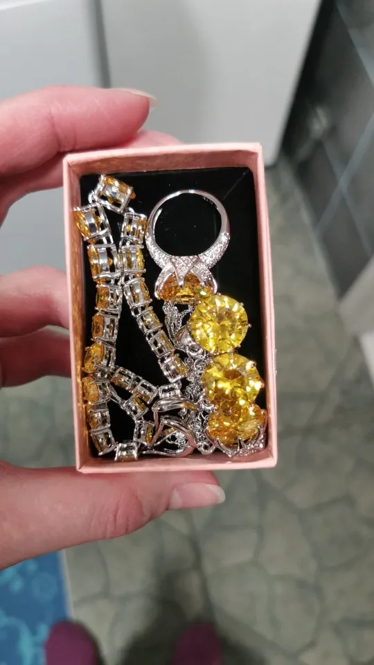 Потрясающий комплект. Пришел быстро, в коробочке. Браслет мне был не нужен (с ним, по моему мнению,- перебор), но без него не заказать все остальное, не хватает комбинации без браслета. Цвет насыщенный ананасовый. Выглядит очень освежающе. Надевала на НГ, очень довольна покупкой.