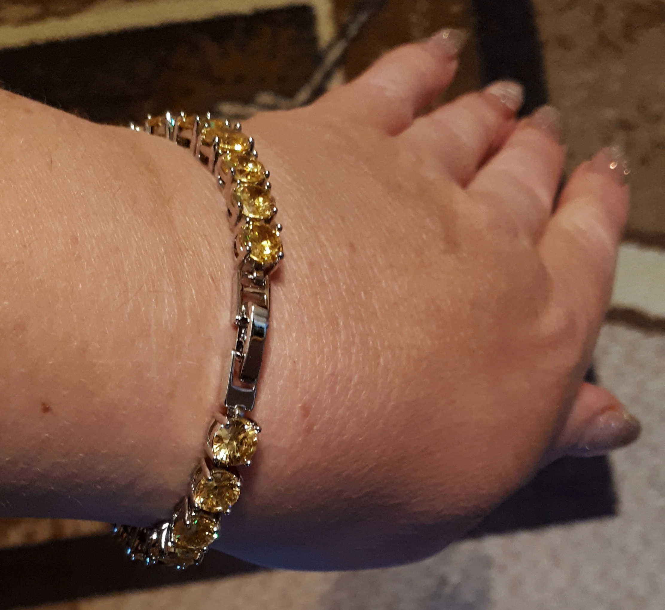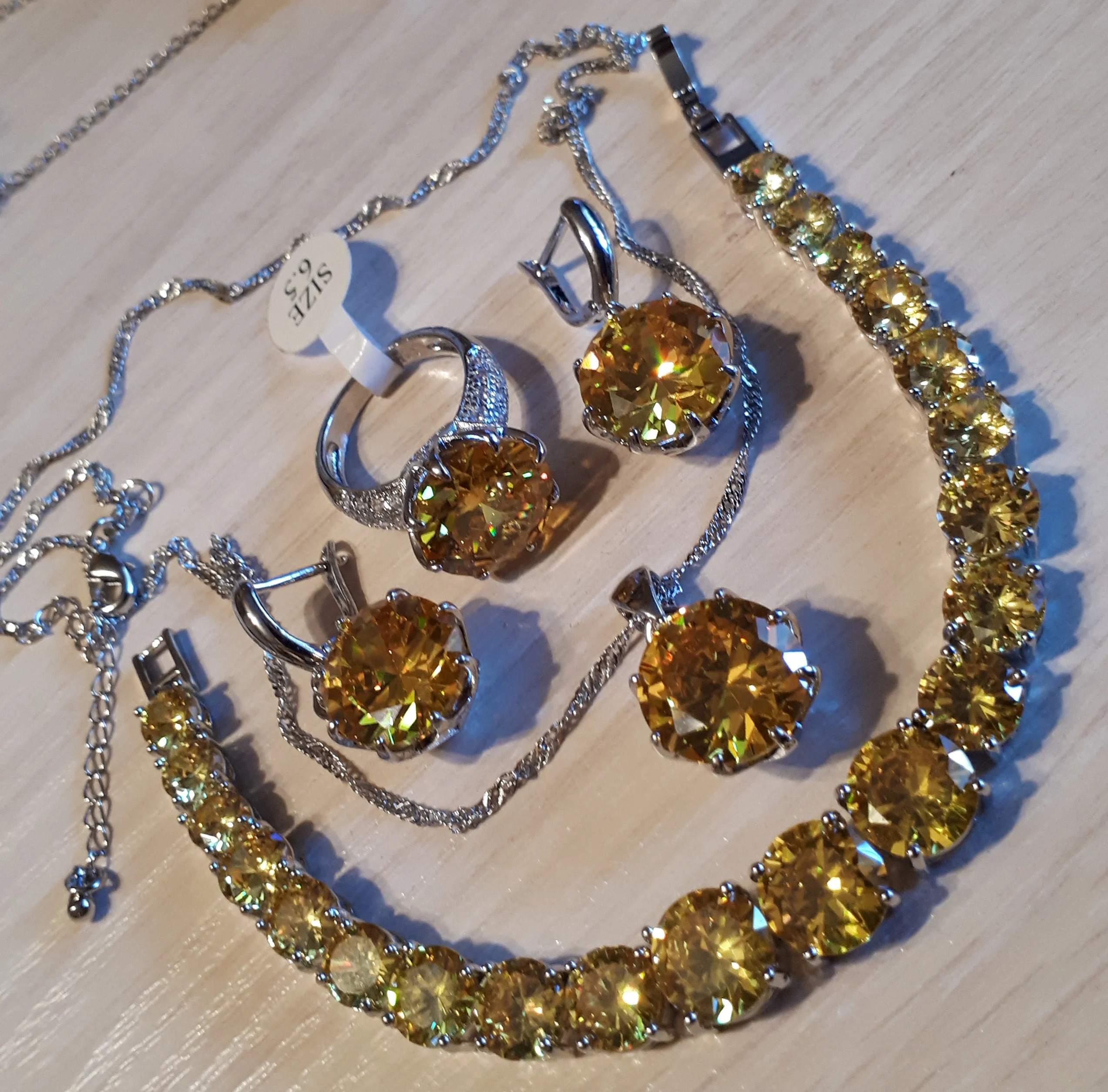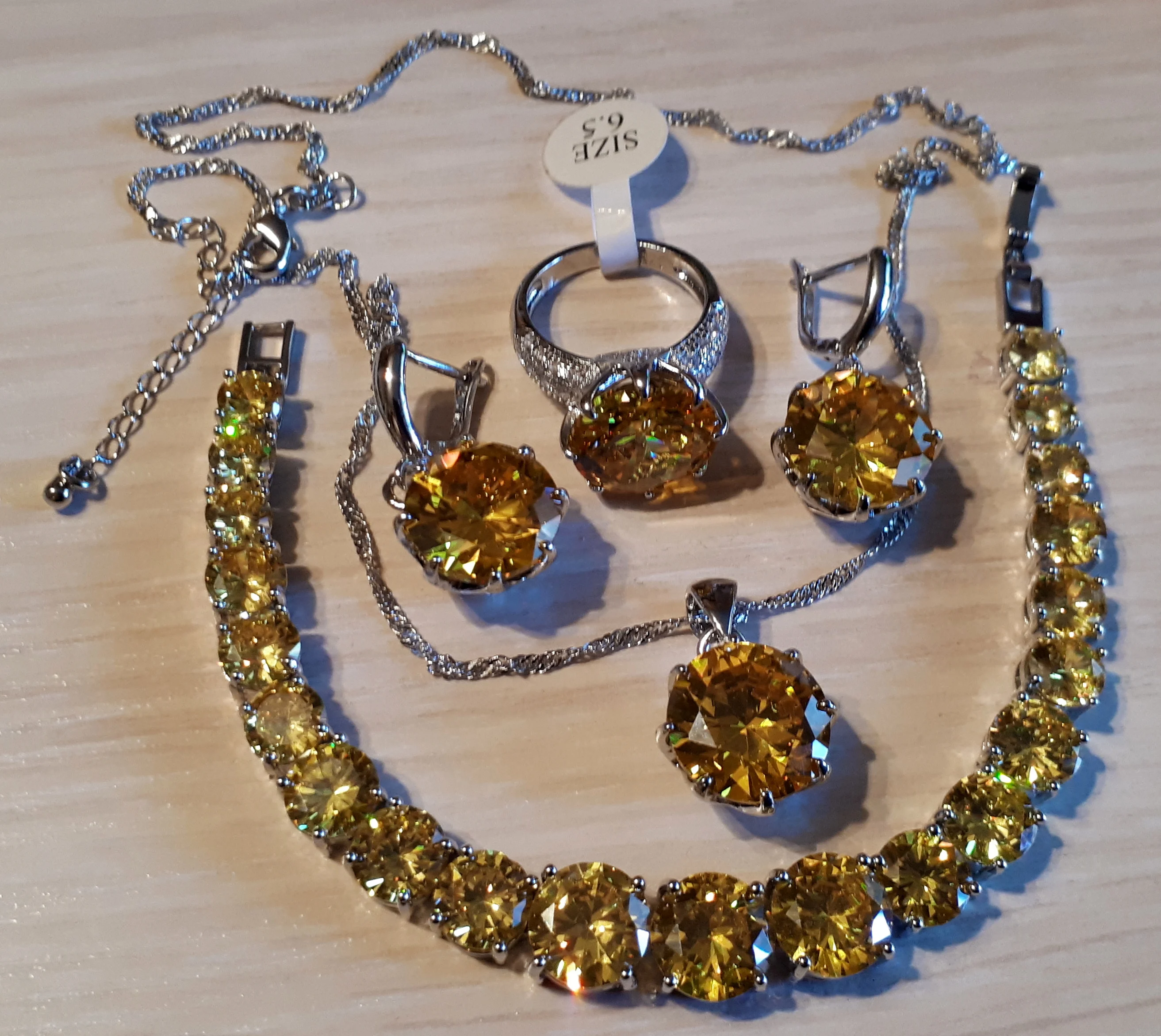 Потрясающий комплект. Пришел быстро, в коробочке. Браслет мне был не нужен (с ним, по моему мнению,- перебор), но без него не заказать все остальное, не хватает комбинации без браслета. Цвет насыщенный ананасовый. Выглядит очень освежающе. Надевала на НГ, очень довольна покупкой.