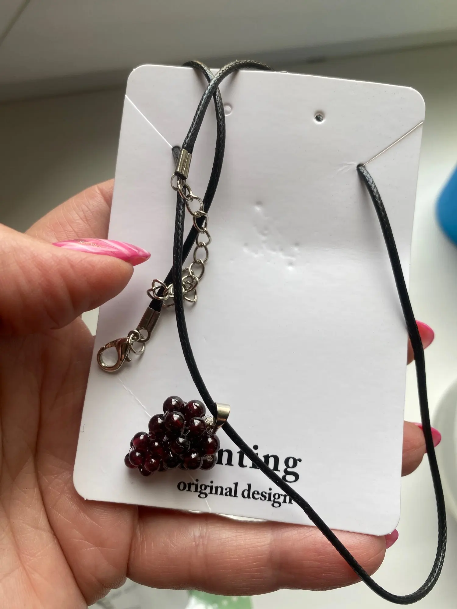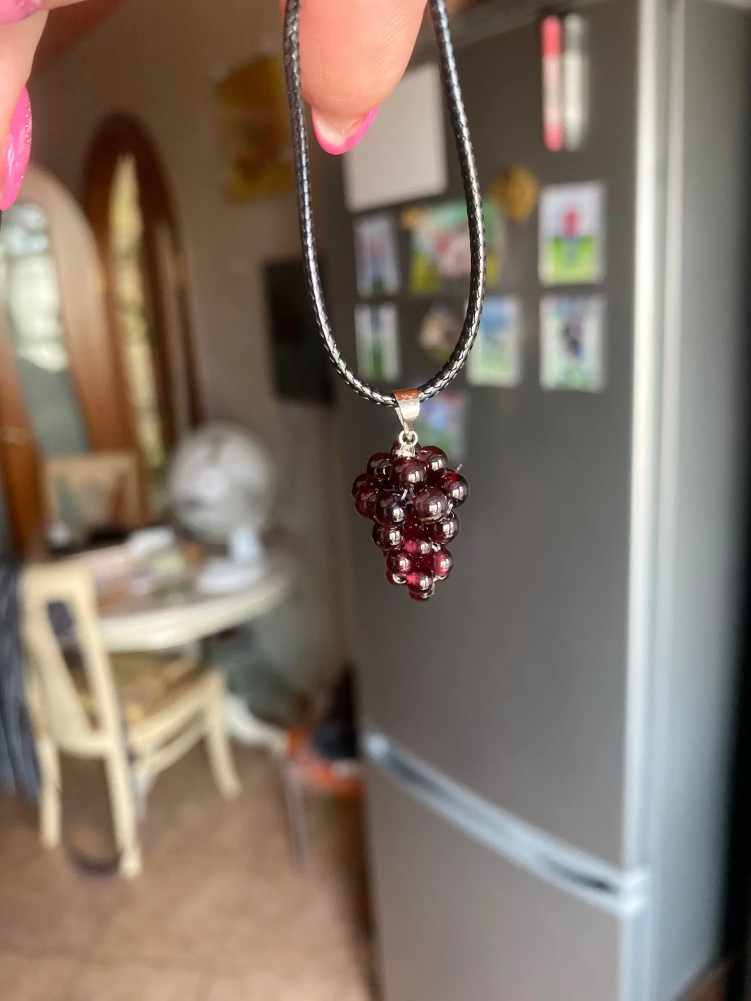Очень красивый кулончик. Длина около 2 см. Диаметр бусин примерно 3 мм. Шнурок 48 см. Брала под такие же серьги. Получился хороший комплект. Не знаю, натуральный камень или нет, но смотрится очень хорошо. Купила со скидкой. пришло за месяц. Положили дополнительный шнурок. Очень довольна покупкой.