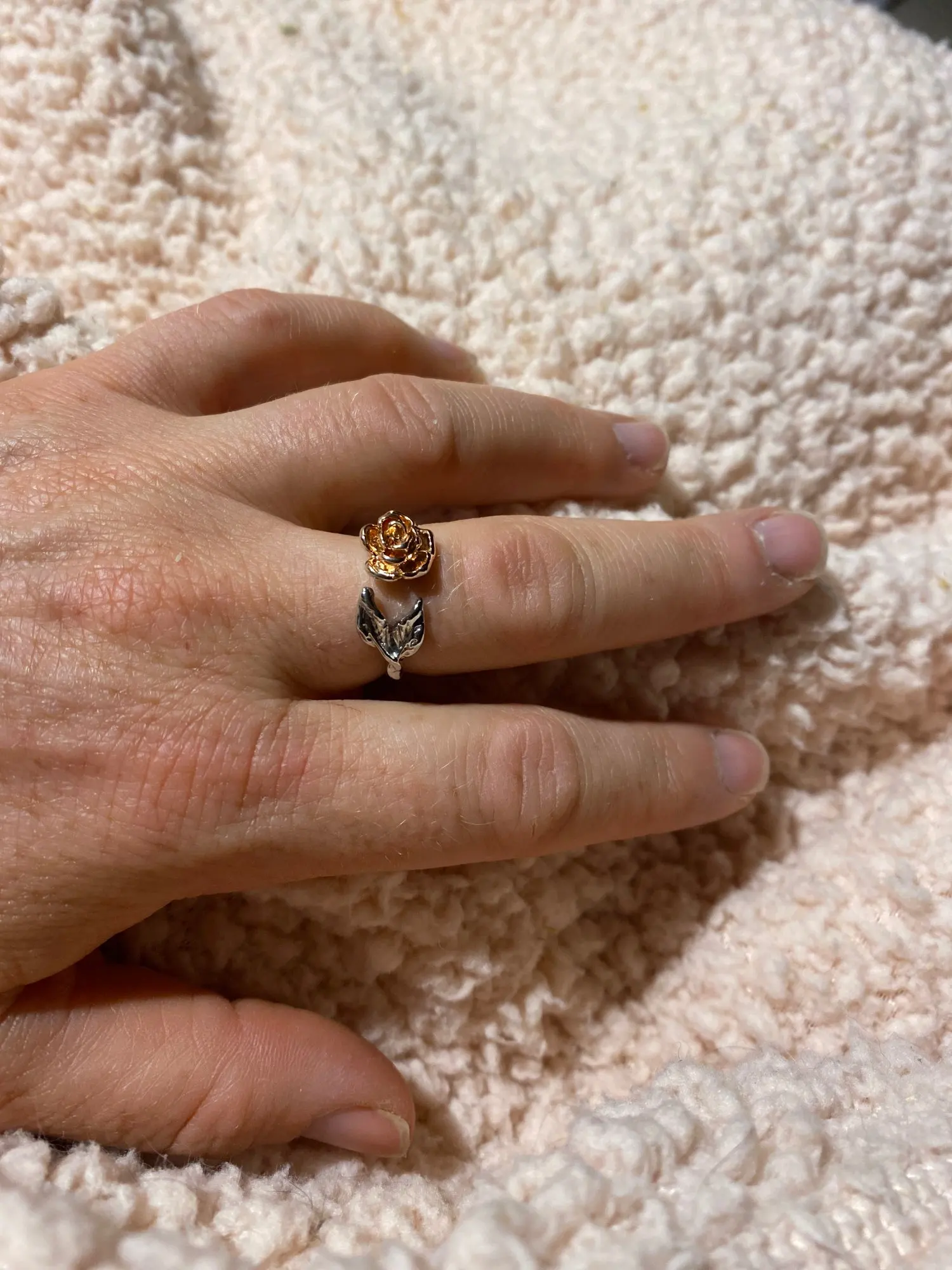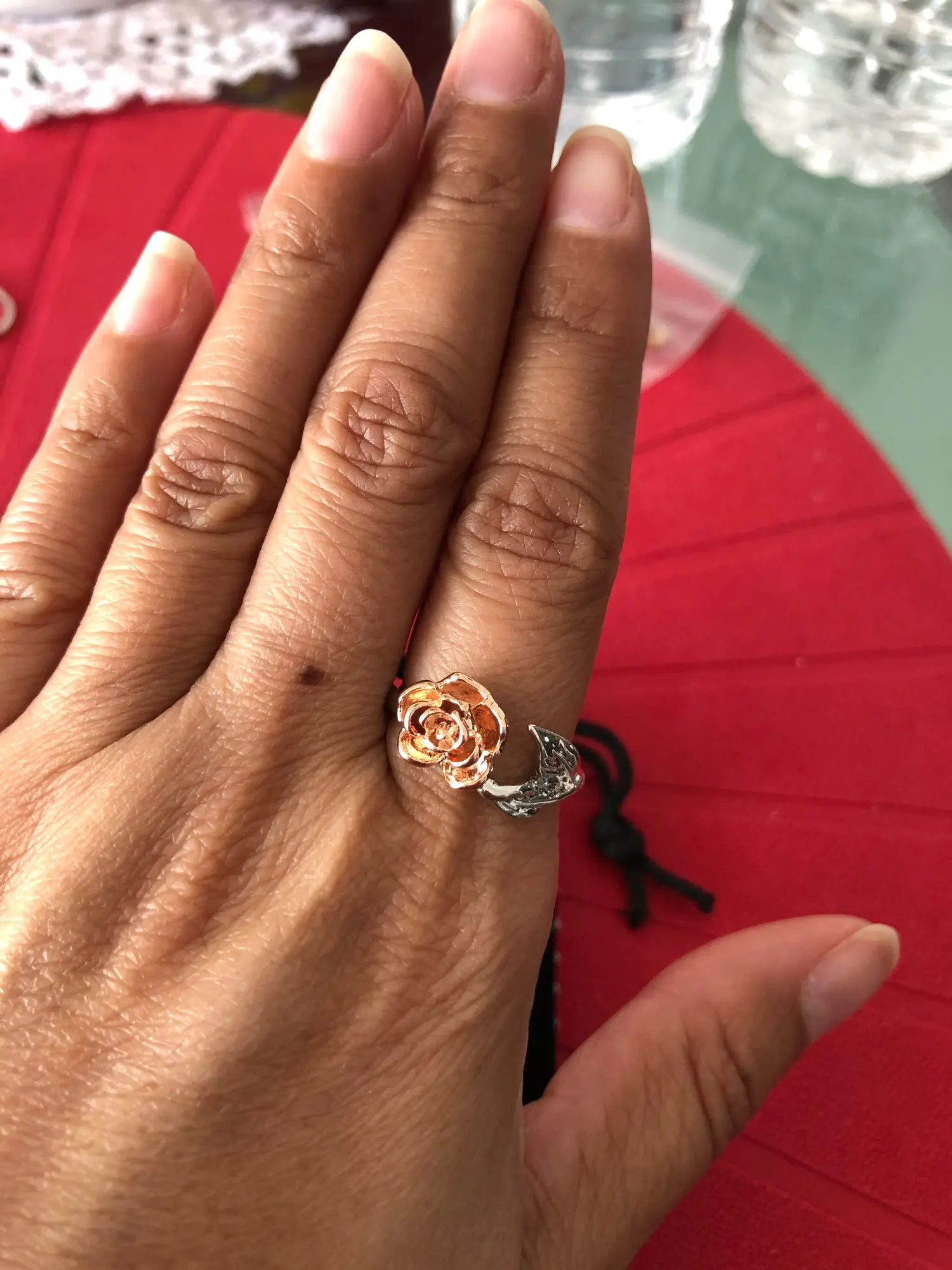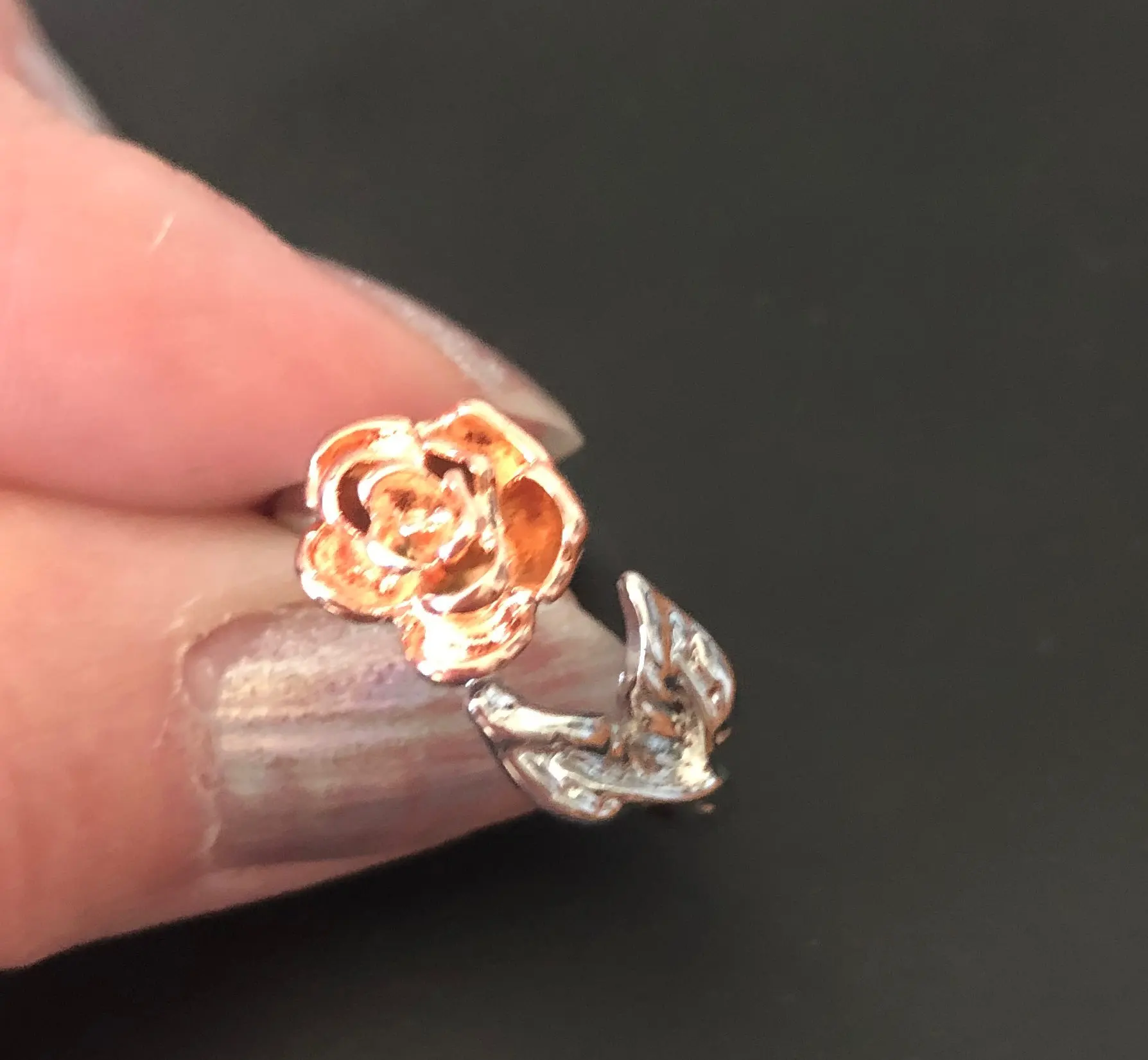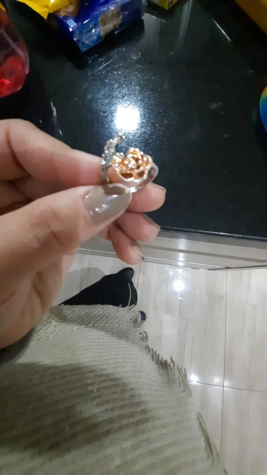 К сожалению, на фото выглядит лучше. Исполнение лепестков и листьев не такое детальное, как на фото. Роза почему-то овальная. Регулируется, носить можно ;) Упаковано хорошо.