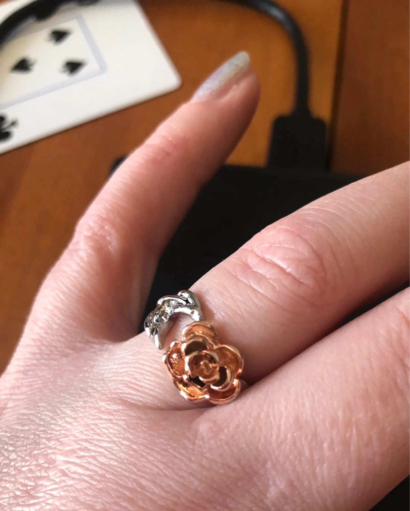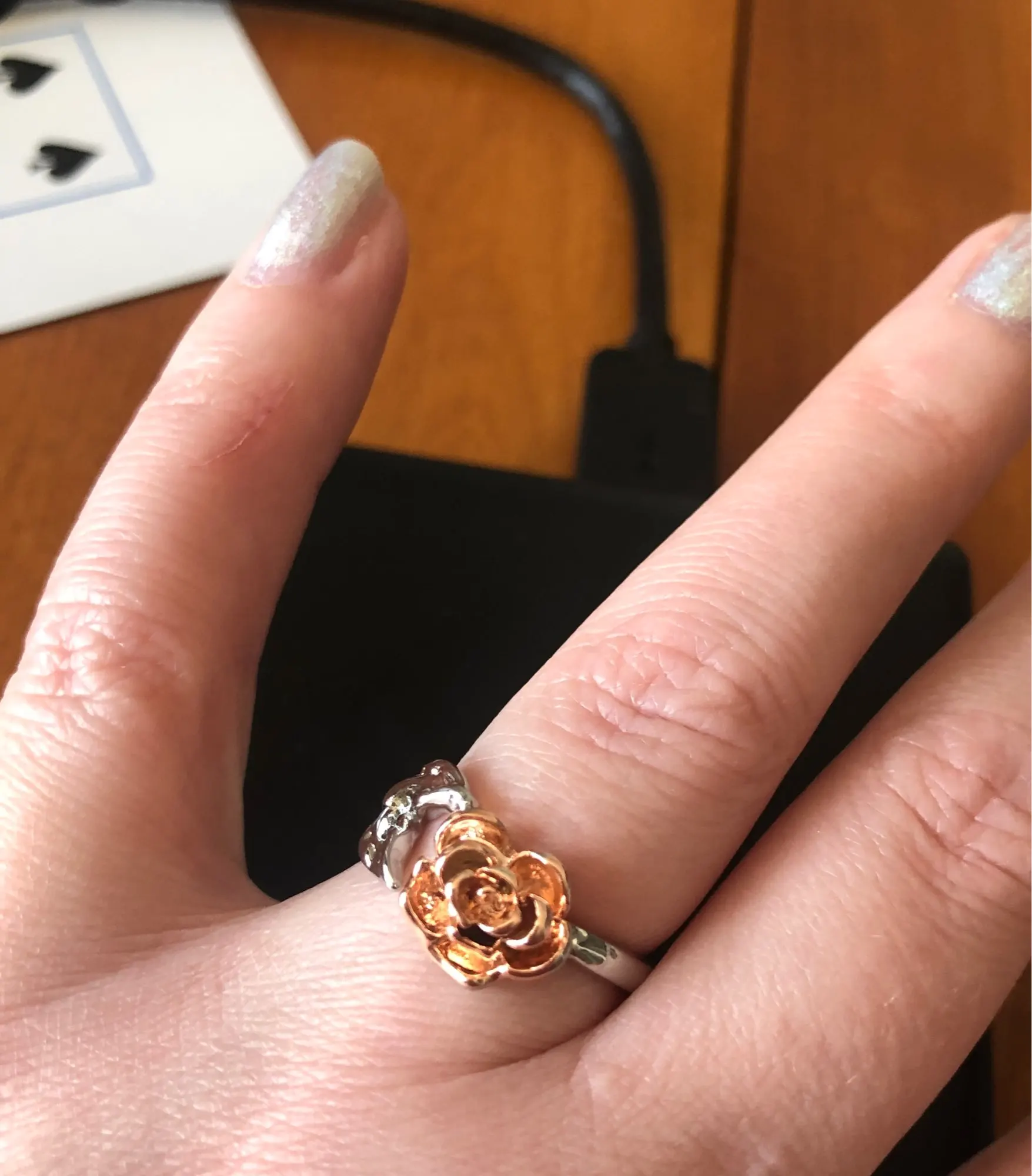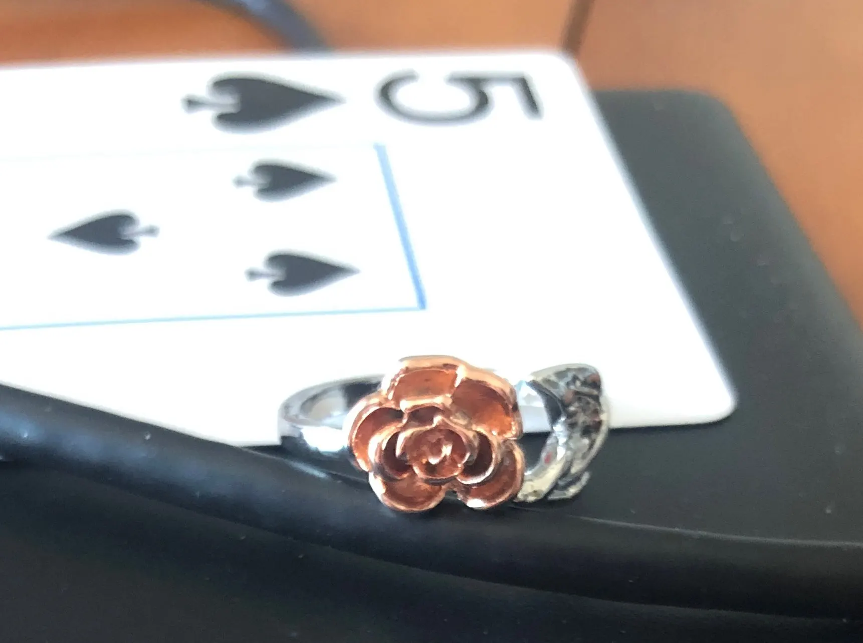 К сожалению, на фото выглядит лучше. Исполнение лепестков и листьев не такое детальное, как на фото. Роза почему-то овальная. Регулируется, носить можно ;) Упаковано хорошо.