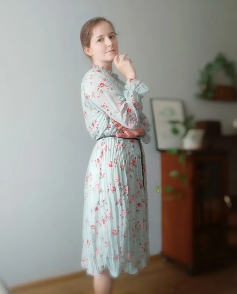 Женское шифоновое плиссированное платье с длинным рукавом, свободное Повседневное платье размера плюс с оборками и расклешенными рукавами...