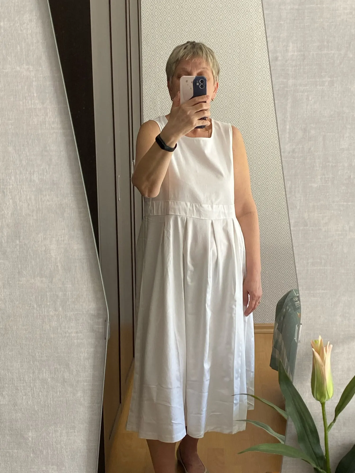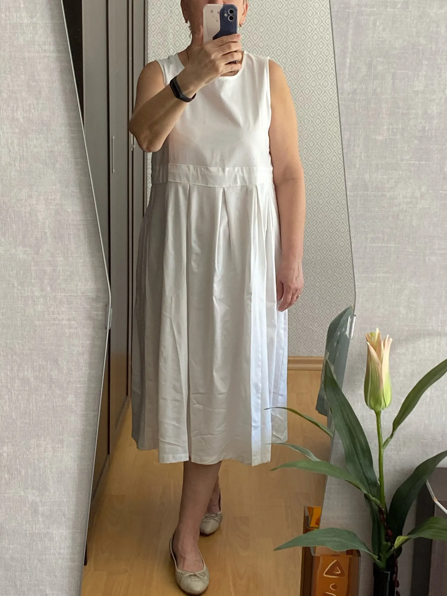 Платье приятное, на миниатюрных девушках с маленькой грудью будет сидеть вообще супер. Я ношу 46-48, грудь 85С, рост 176, взяла XL, село отлично, нигде не давит, длина на середине икры. Ниток не нашла нигде, гладится хорошо, не мнется. Единственное - я бы хотела, чтобы цвет был потемнее, на солнце он прямо синий, черный был бы поэлегантнее. Фото нашла только такое, платье ношу в офис с пиджаком. И кстати тут кто-то писал про то, что ткань тяжеленькая. Не сказала бы. Обычный плотный лен с хлопком, можно было и поплотнее сделать)