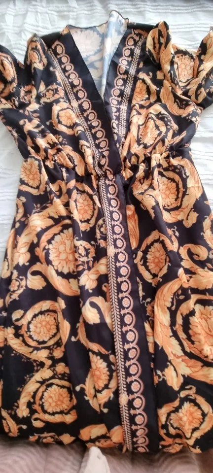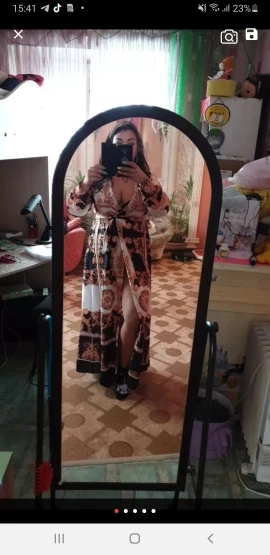 На рост 152 туника до колен, могу носить вместо платья. Начиталась что очень давит в области талии и заказала М (обычно S ношу) и на параметры 85*65*65 оказалось большим. Но возвращать не буду, пояс поставлю широкий и все. А так очень красиво, конечно. Заказывала чёрный с цветами, цветы яркие насыщенные.