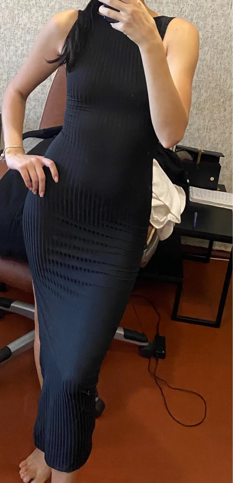 интересное платье,выглядит красиво,100% синтетика,но к телу приятное на параметры 89-65-98 на попе туговато,но в целом сидит хорошо.