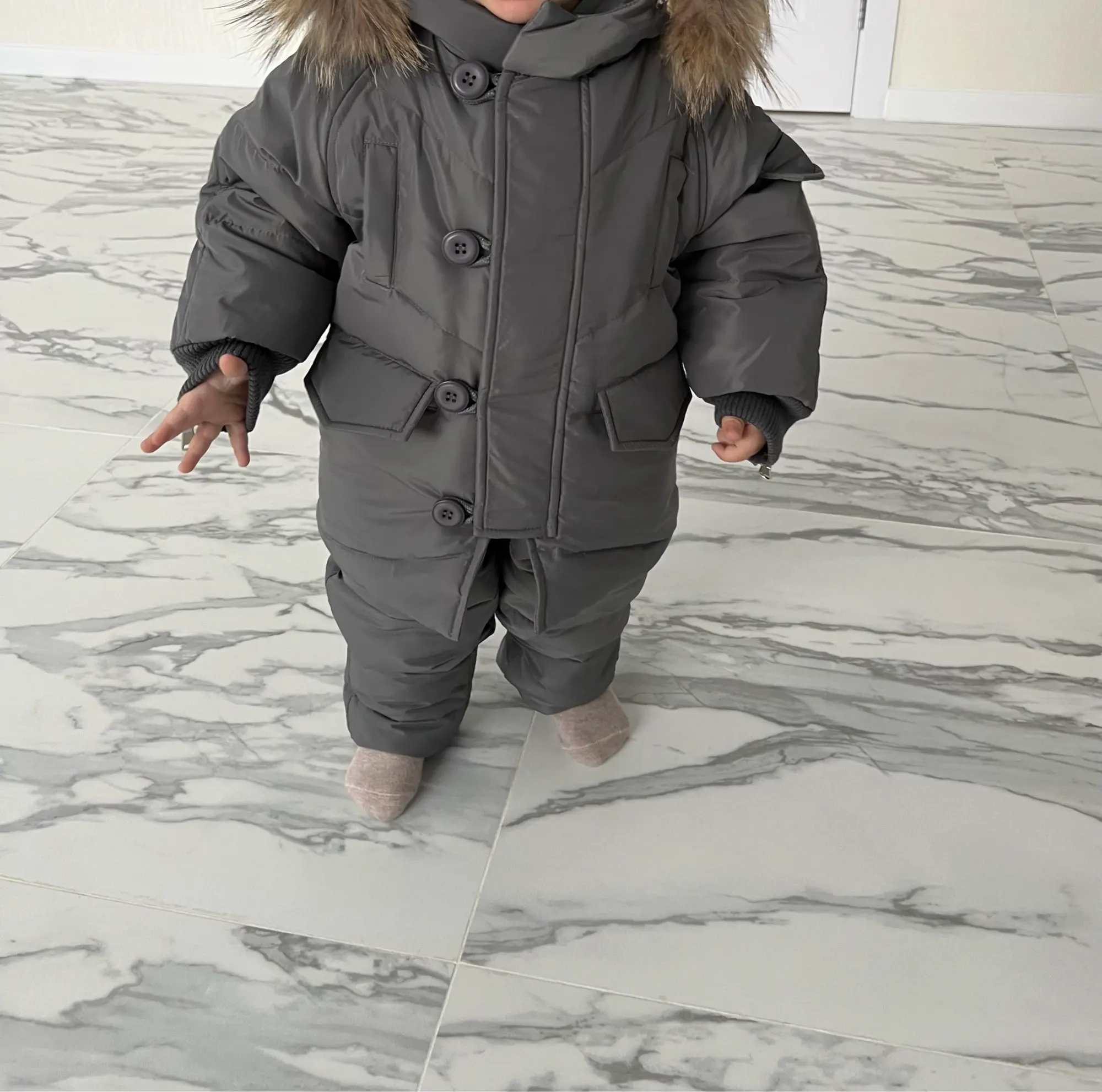 Комбинезон хороший,смотрится очень красиво.На вид кажется тонковат ,но с тёплым слипом в -14 ребёнок не замерз.Ребенку 1,5 года на рост 80 взяла размер 2Т,с очень хорошим запасом ещё на сантиметров 10, на бирках написано 90 видимо это на рост 90,но штаны можно загнут и ничего не заметно.Мех порадовал,не слишком пышный и не такой облезлый,на вид красивый,и что важно не лезет ни в рот ни в глаза.Шёл месяц,может бы он пришёл раньше,но с новогодними праздниками получилось чуть дольше чем я ожидала.Продавец общительный,заказ отправил сразу как я попросила.